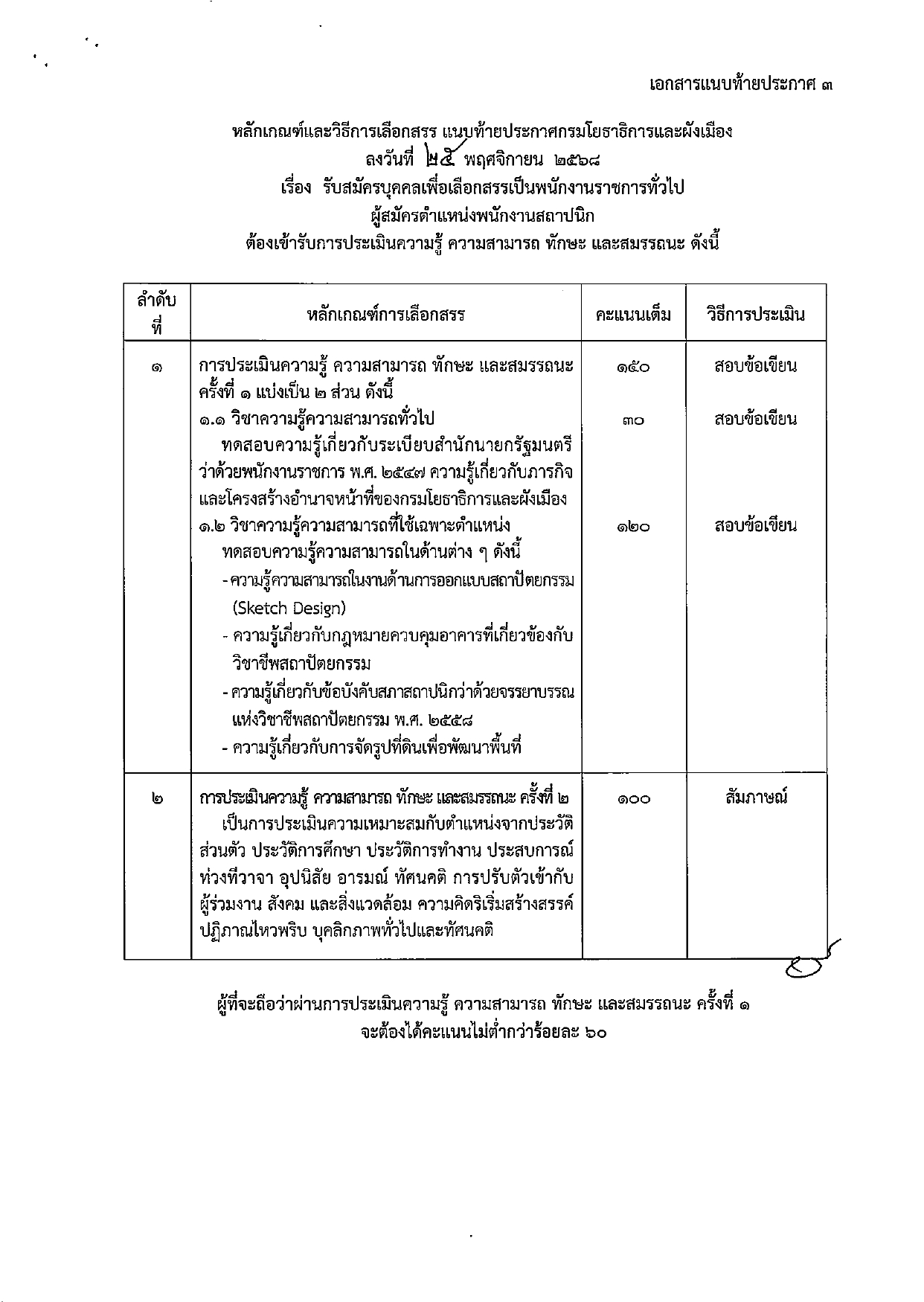 คุณสมบัติเฉพาะสำหรับตำแหน่ง: ผู้สมัครต้องได้รับวุฒิการศึกษาระดับปริญญาตรี หรือคุณวุฒิอย่างอื่นที่เทียบได้ในระดับเดียวกัน ในสาขาวิชาสถาปัตยกรรมศาสตร์ ทางสถาปัตยกรรม ทางเทคโนโลยีสถาปัตยกรรม หรือทางสถาปัตยกรรมไทย และจะต้องได้รับใบอนุญาตเป็นผู้ประกอบวิชาชีพสถาปัตยกรรมควบคุมตามที่กฎหมายกำหนด (โดยต้องได้รับอนุญาตภายในวันปิดรับสมัคร คือวันที่ 19 ธันวาคม 2568)