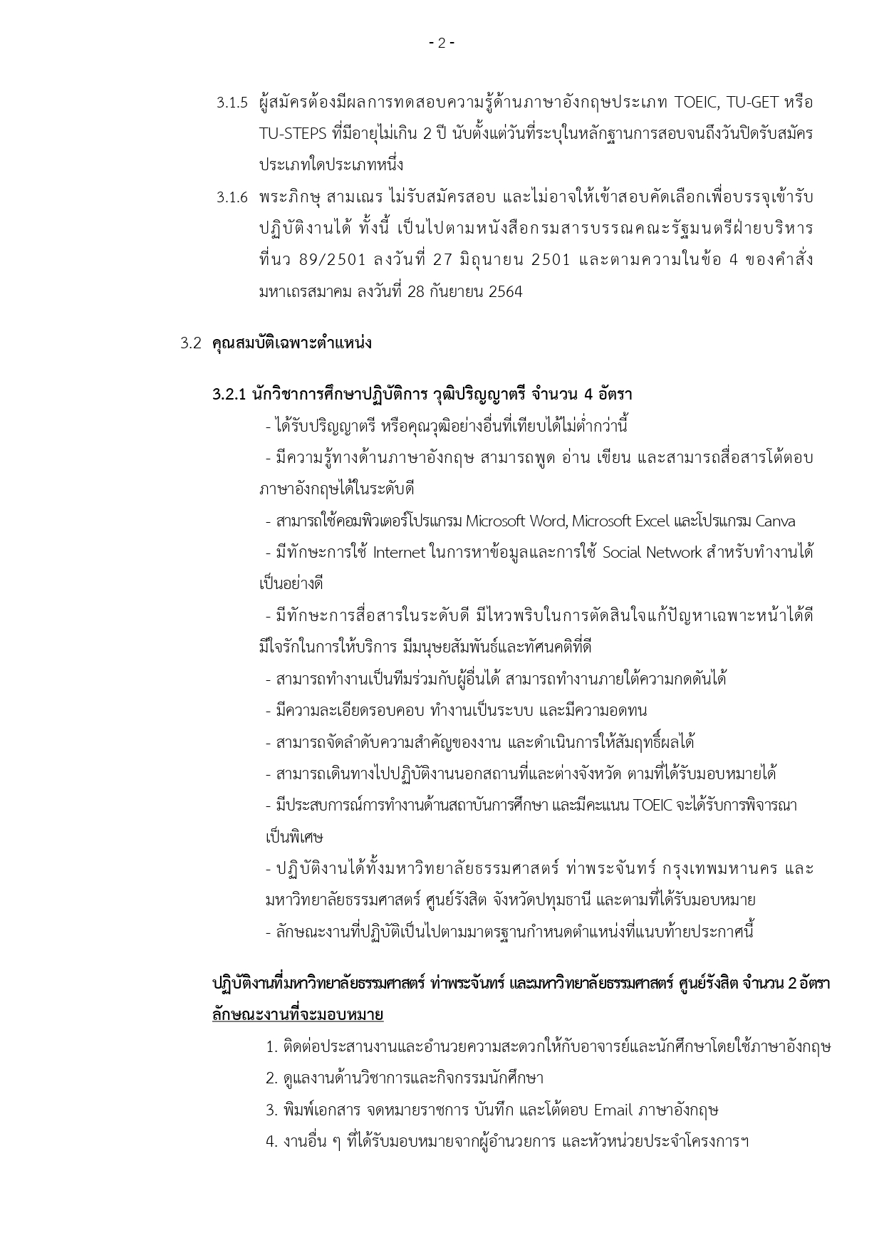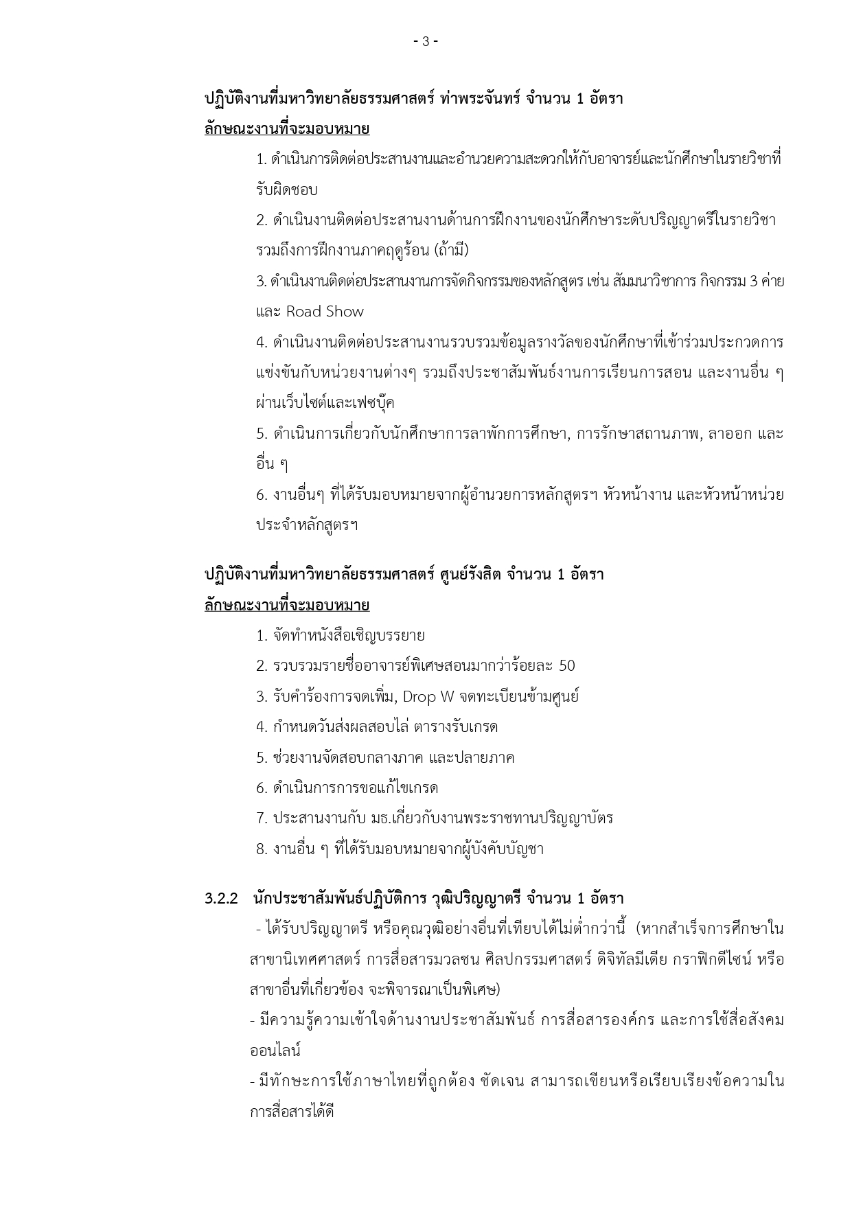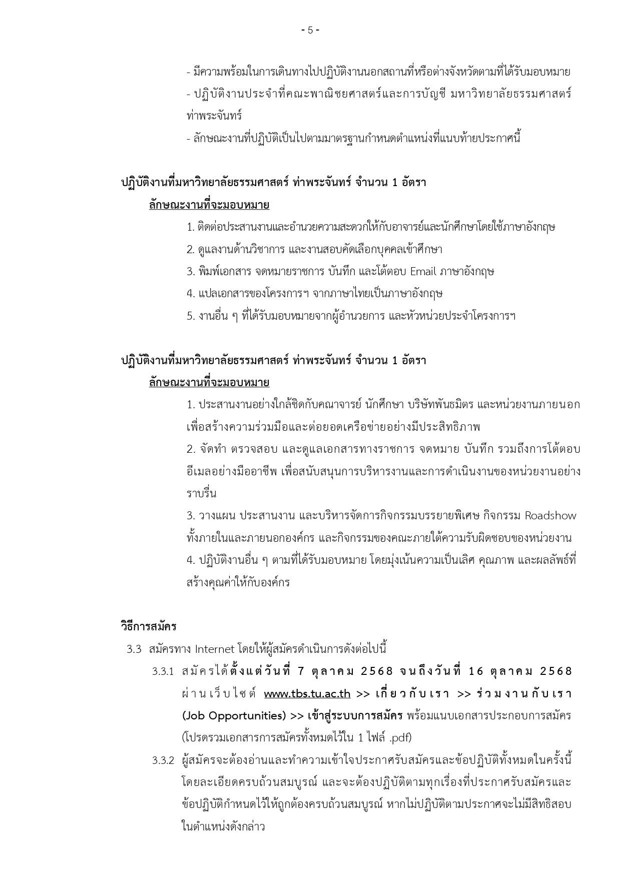 - ลักษณะงานหลัก: ติดต่อประสานงานและอำนวยความสะดวกอาจารย์/นักศึกษา (โดยใช้ภาษาอังกฤษ) ดูแลงานวิชาการและกิจกรรมนักศึกษา งานธุรการเอกสาร โต้ตอบ Email ภาษาอังกฤษ และงานอื่น ๆ ที่ได้รับมอบหมาย โดยมีจุดปฏิบัติงานทั้งที่ท่าพระจันทร์และศูนย์รังสิต