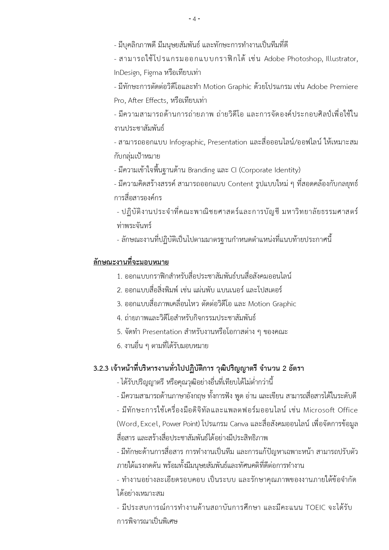 - คุณสมบัติเฉพาะที่สำคัญ: ต้องได้รับปริญญาตรี (หากจบสาขานิเทศศาสตร์, การสื่อสารมวลชน, กราฟิกดีไซน์ หรือที่เกี่ยวข้อง จะพิจารณาเป็นพิเศษ) ต้องมีทักษะการใช้ภาษาไทยที่ถูกต้องในการเรียบเรียงข้อความ มีบุคลิกภาพดี สามารถใช้โปรแกรมออกแบบกราฟิก เช่น Adobe Photoshop, Illustrator และมีทักษะการตัดต่อวิดีโอ/ทำ Motion Graphic เช่น Adobe Premiere Pro, After Effects
