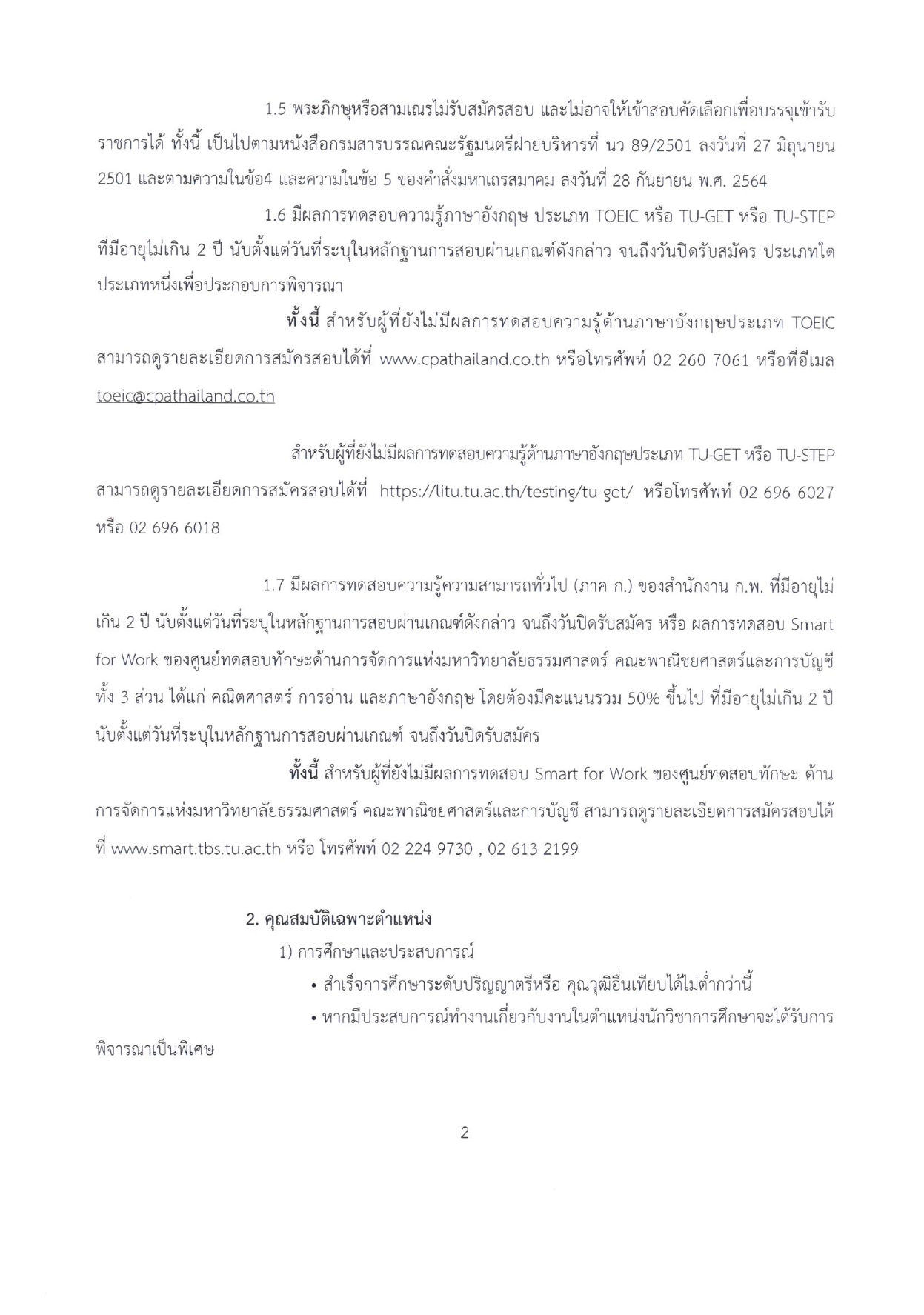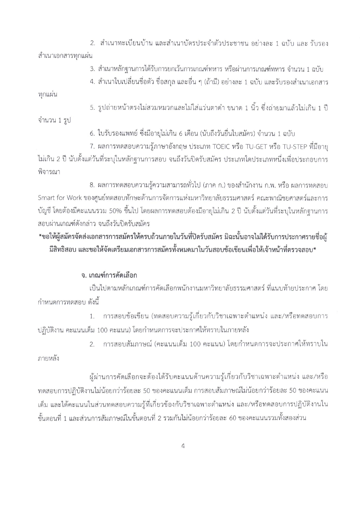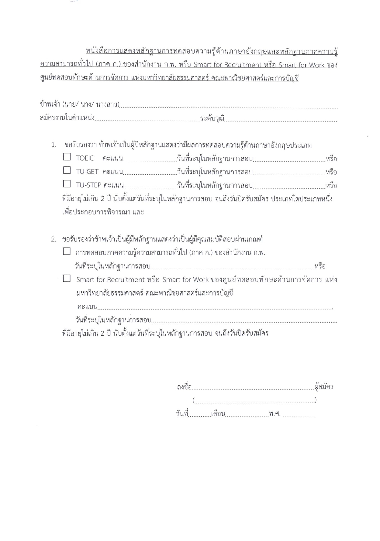 ผลสอบความสามารถทั่วไป: ต้องมีผลการทดสอบ ภาค ก ของ ก.พ. หรือ ผลสอบ Smart for Work ของ มธ. (คะแนนรวม 50% ขึ้นไป) ที่มีอายุไม่เกิน 2 ปี นับถึงวันปิดรับสมัคร