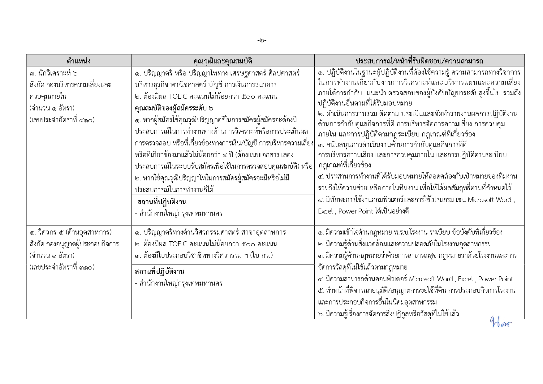 นักวิเคราะห์ 6 (1 อัตรา): ป.ตรี (ประสบการณ์ 4 ปี) หรือ ป.โท สาขาเศรษฐศาสตร์, บัญชี, การเงิน, บริหารฯ