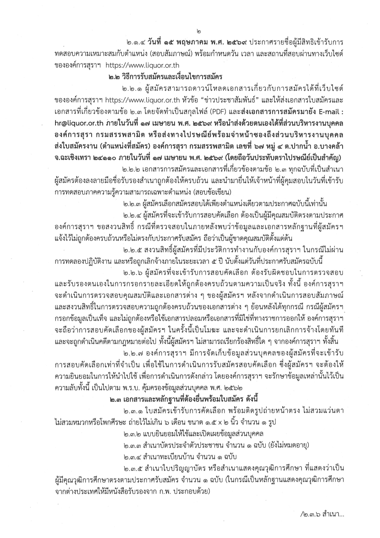 ทางไปรษณีย์: ส่งถึง ส่วนบริหารงานบุคคล (ระบุตำแหน่งที่สมัคร) องค์การสุรา กรมสรรพสามิต เลขที่ 67 หมู่ 4 ต.ปากน้ำ อ.บางคล้า จ.ฉะเชิงเทรา 24110 (ยึดวันประทับตราไปรษณีย์ภายใน 17 เม.ย. 69)