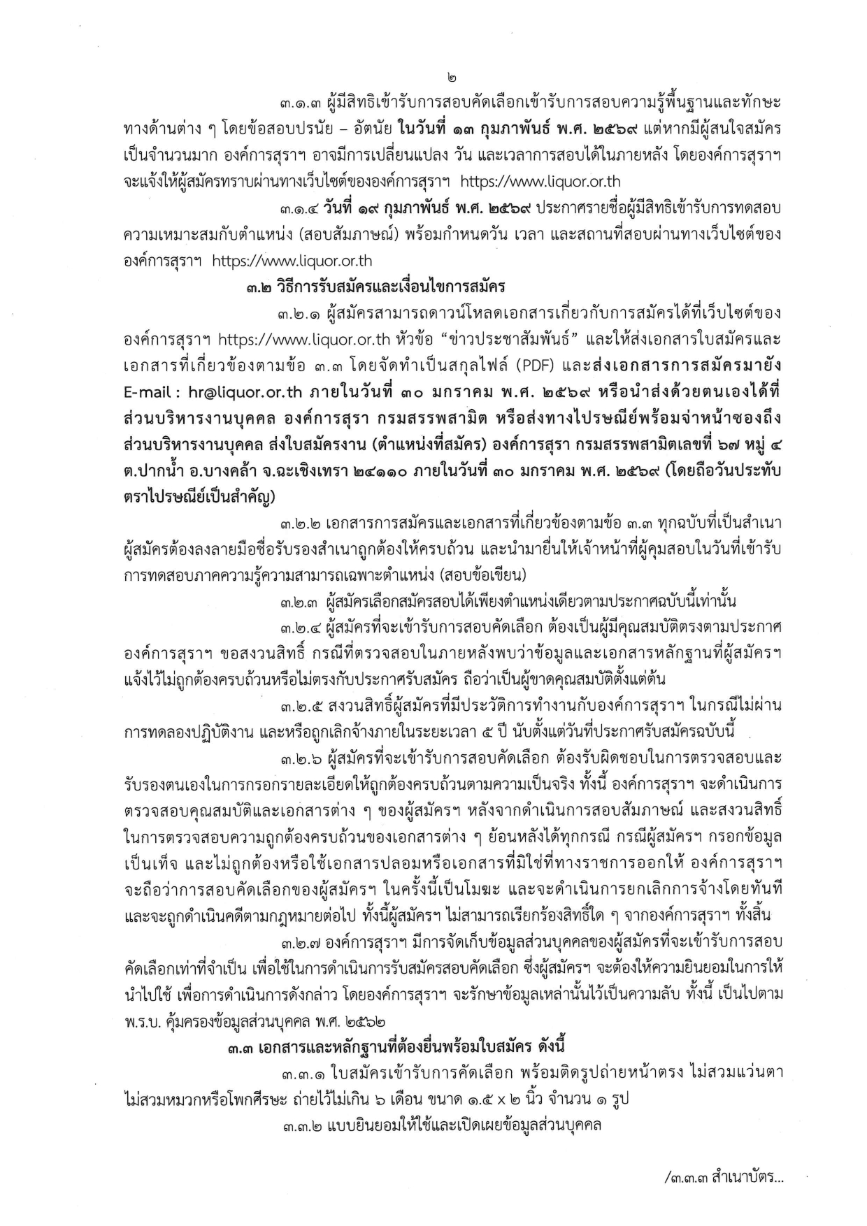 ไปรษณีย์: ส่งมาที่ ส่วนบริหารงานบุคคล องค์การสุรา กรมสรรพสามิต เลขที่ 67 หมู่ 4 ต.ปากน้ำ อ.บางคล้า จ.ฉะเชิงเทรา 24110 (ถือวันประทับตราไปรษณีย์เป็นสำคัญ)