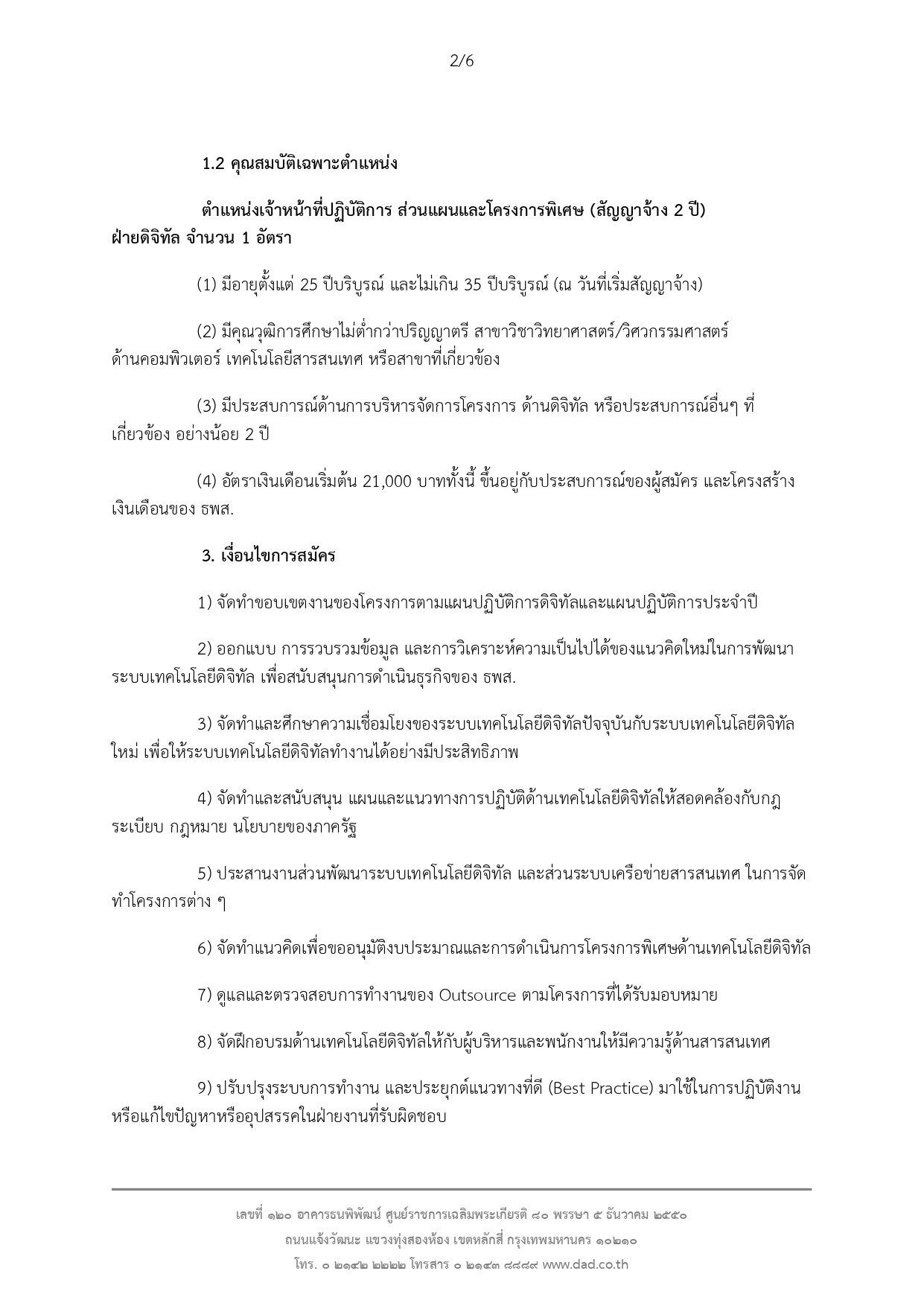 ประสบการณ์: มีประสบการณ์อย่างน้อย 2 ปี ด้านการบริหารจัดการโครงการ, ด้านดิจิทัล หรือประสบการณ์อื่นที่เกี่ยวข้อง