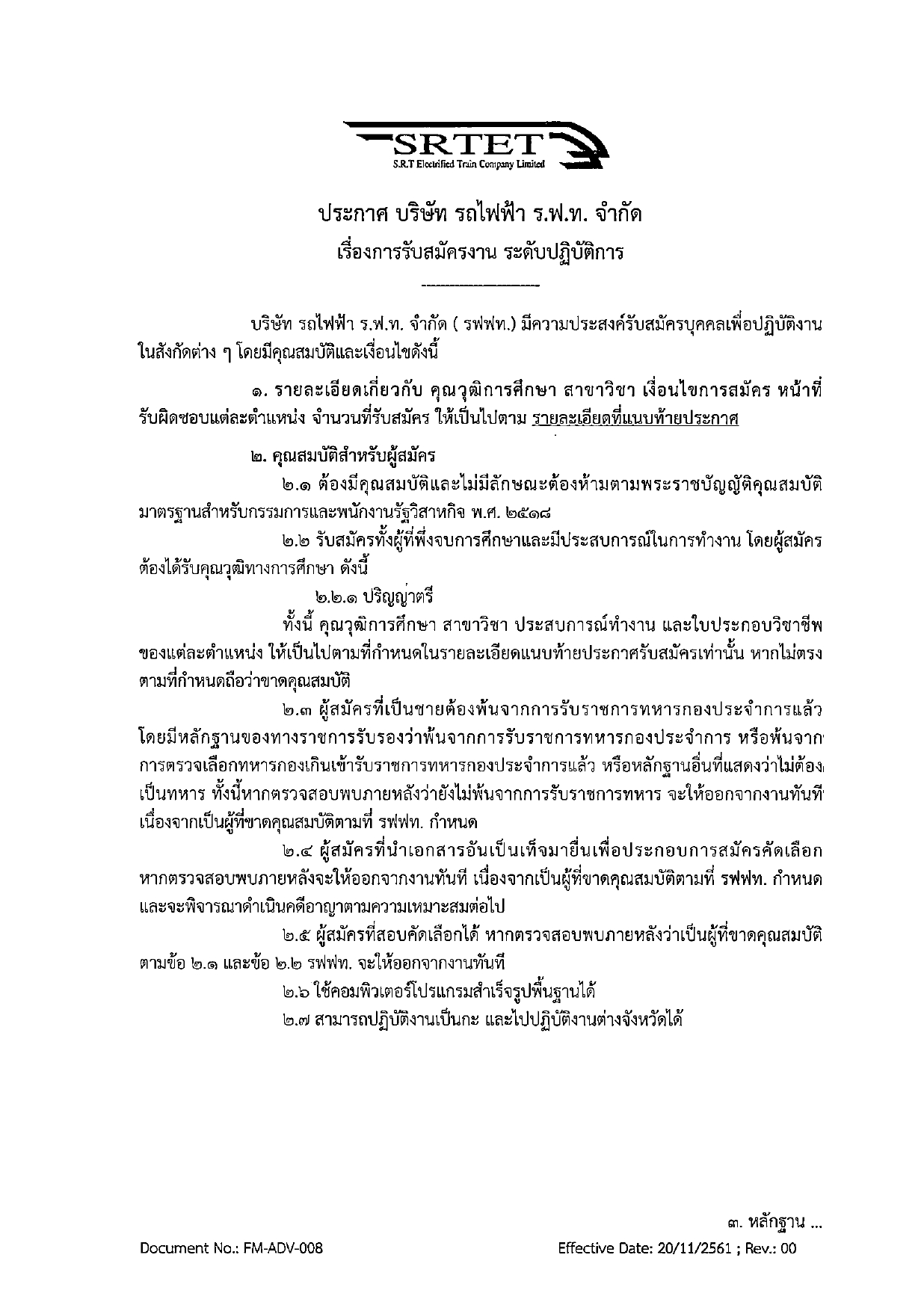 รถไฟฟ้า ร.ฟ.ท. จำกัด มีความประสงค์จะรับสมัครบุคคลภายนอกเพื่อคัดเลือกและบรรจุเป็นพนักงานในตำแหน่งต่างๆ ดังนี้