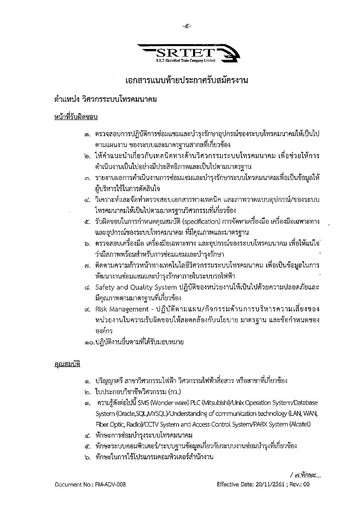 บริษัท รถไฟฟ้า ร.ฟ.ท. จำกัด สำหรับตำแหน่ง วิศวกรระบบโทรคมนาคม ปี