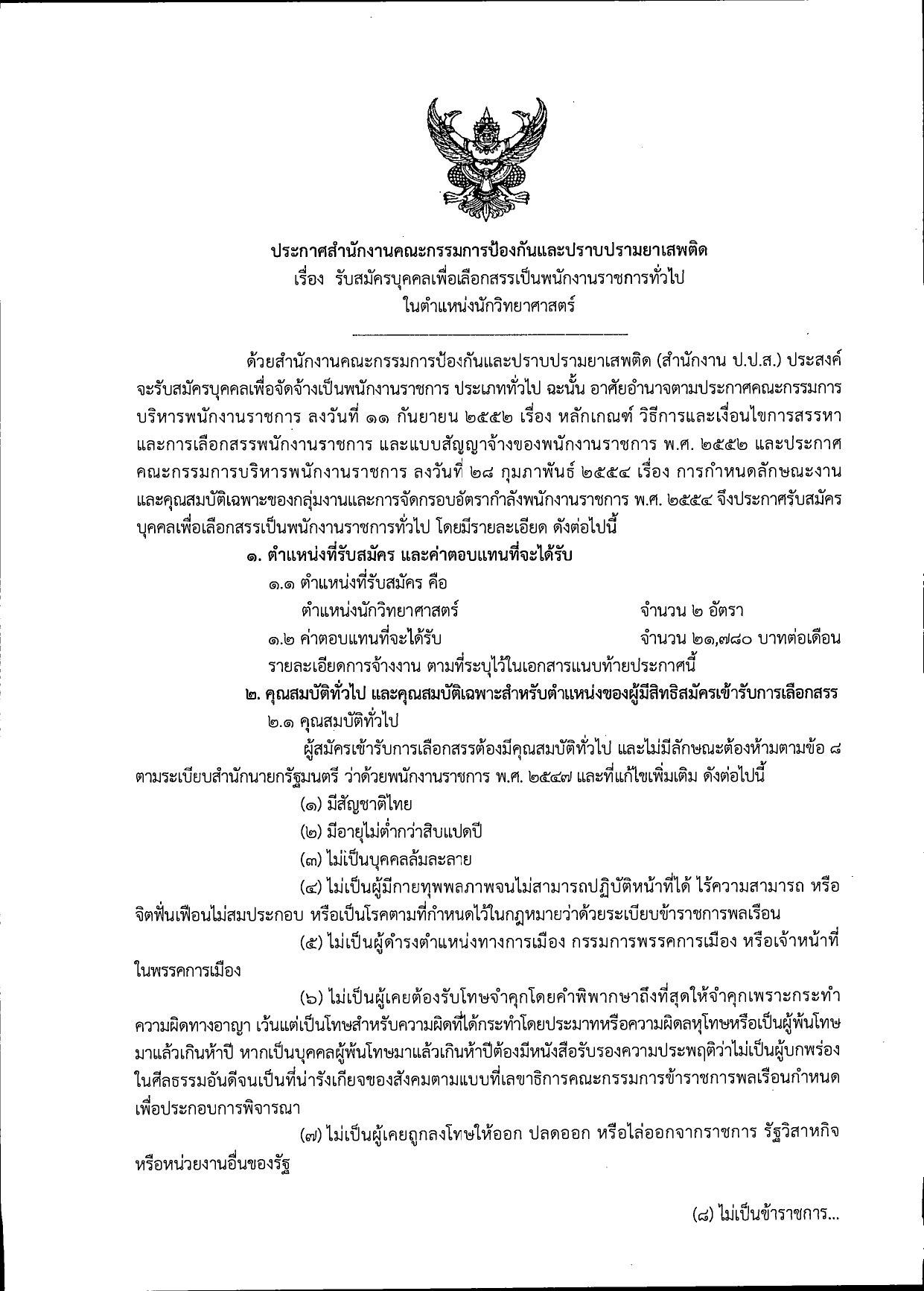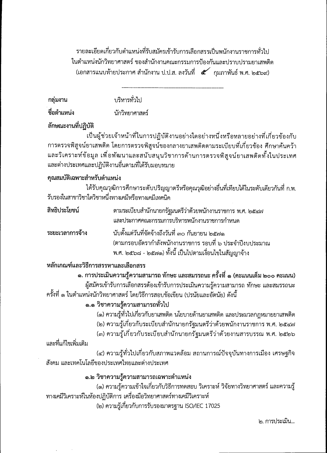 เรื่อง รับสมัครบุคคลเพื่อเลือกสรรเป็นพนักงานราชการทั่วไป ในตำแหน่งนักวิทยาศาสตร์