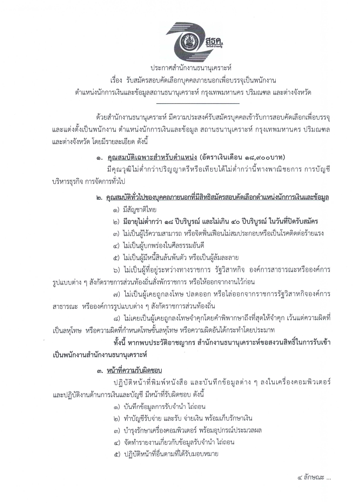 เรื่อง รับสมัครพนักงานและบุคคลภายนอกเพื่อเป็นพนักงานสำนักงานธนานุเคราะห์
