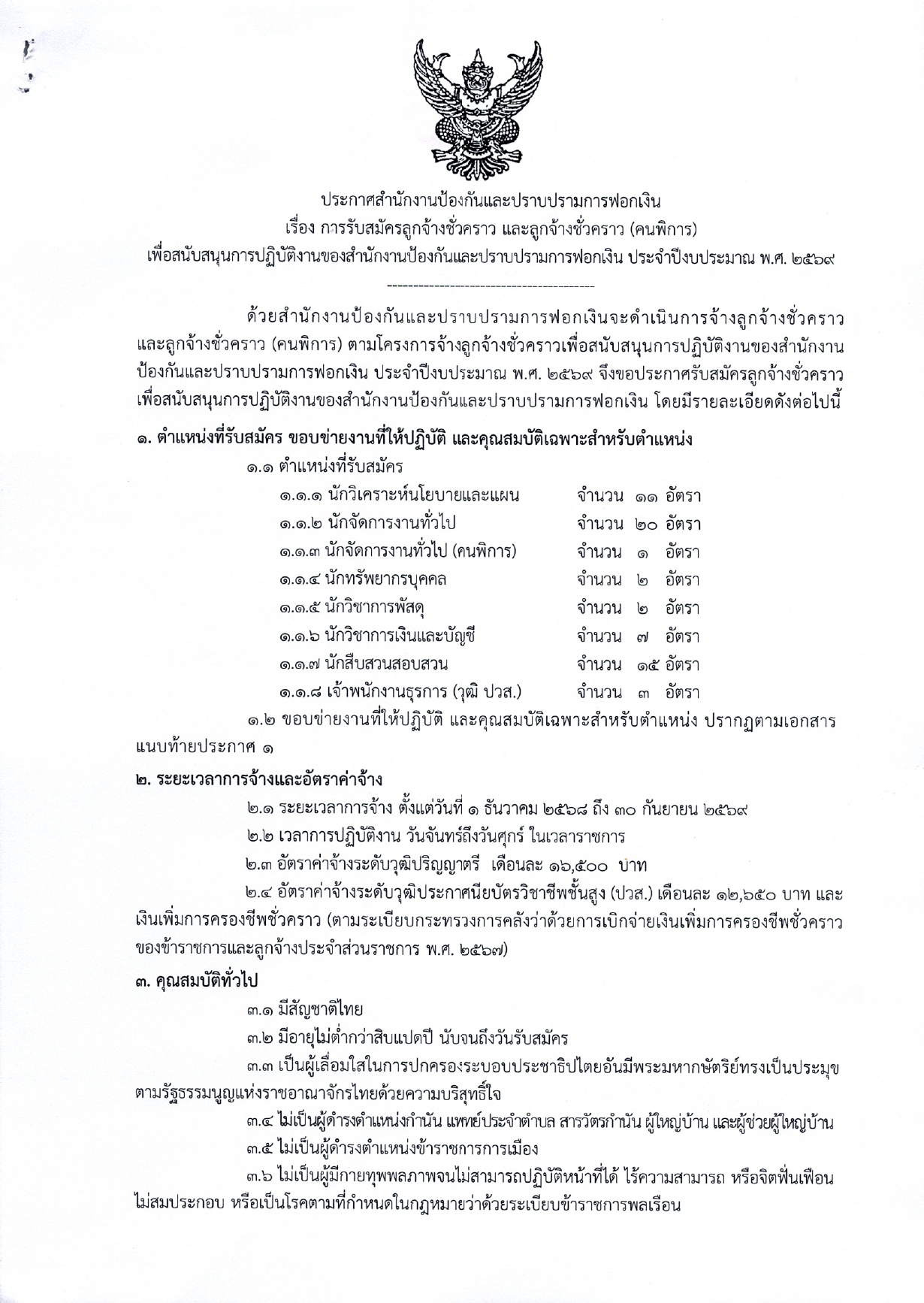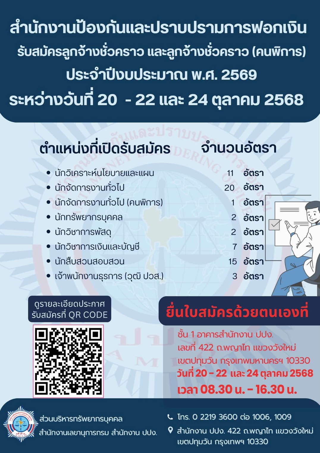 ประกาศสำนักงานป้องกันและปราบปรามการฟอกเงิน เรื่อง การรับสมัครลูกจ้างชั่วคราว ประจำปีงบประมาณ พ.ศ. 2569