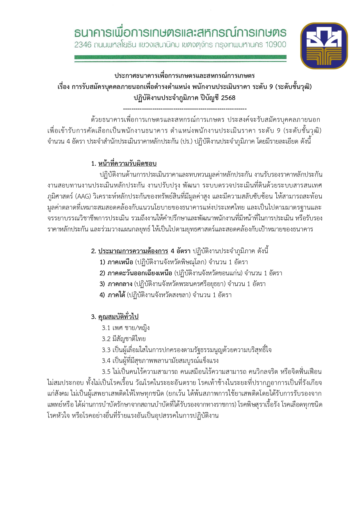 ธนาคารเพื่อการเกษตรและสหกรณ์การเกษตร (ธ.ก.ส.) รับสมัครบุคคลภายนอกเพื่อเป็นพนักงาน วุฒิ ปริญญาตรี หลายสาขา / ไม่ต้องผ่าน ภาค ก ของ กพ. / เงินเดือน 31500 / สมัคร online 29 พฤศจิกายน 2568 – 10 ธันวาคม 2568
