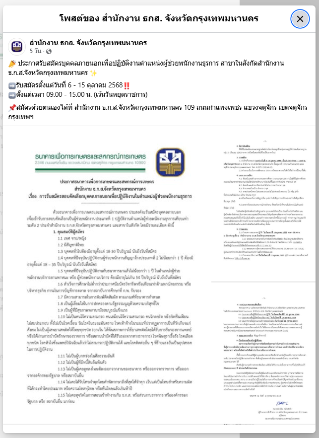 ธนาคารเพื่อการเกษตรและสหกรณ์การเกษตร (ธ.ก.ส.) เปิดรับสมัครบุคคลภายนอกเพื่อเป็นพนักงาน  / ไม่ต้องผ่าน ภาค ก ของ กพ. / สมัคร 6 – 15 ต.ค. 2568
