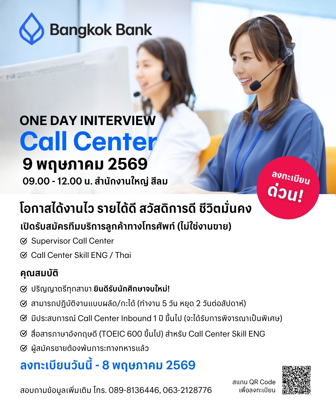 ประกาศรับสมัครงาน: ธนาคารกรุงเทพ (Call Center)