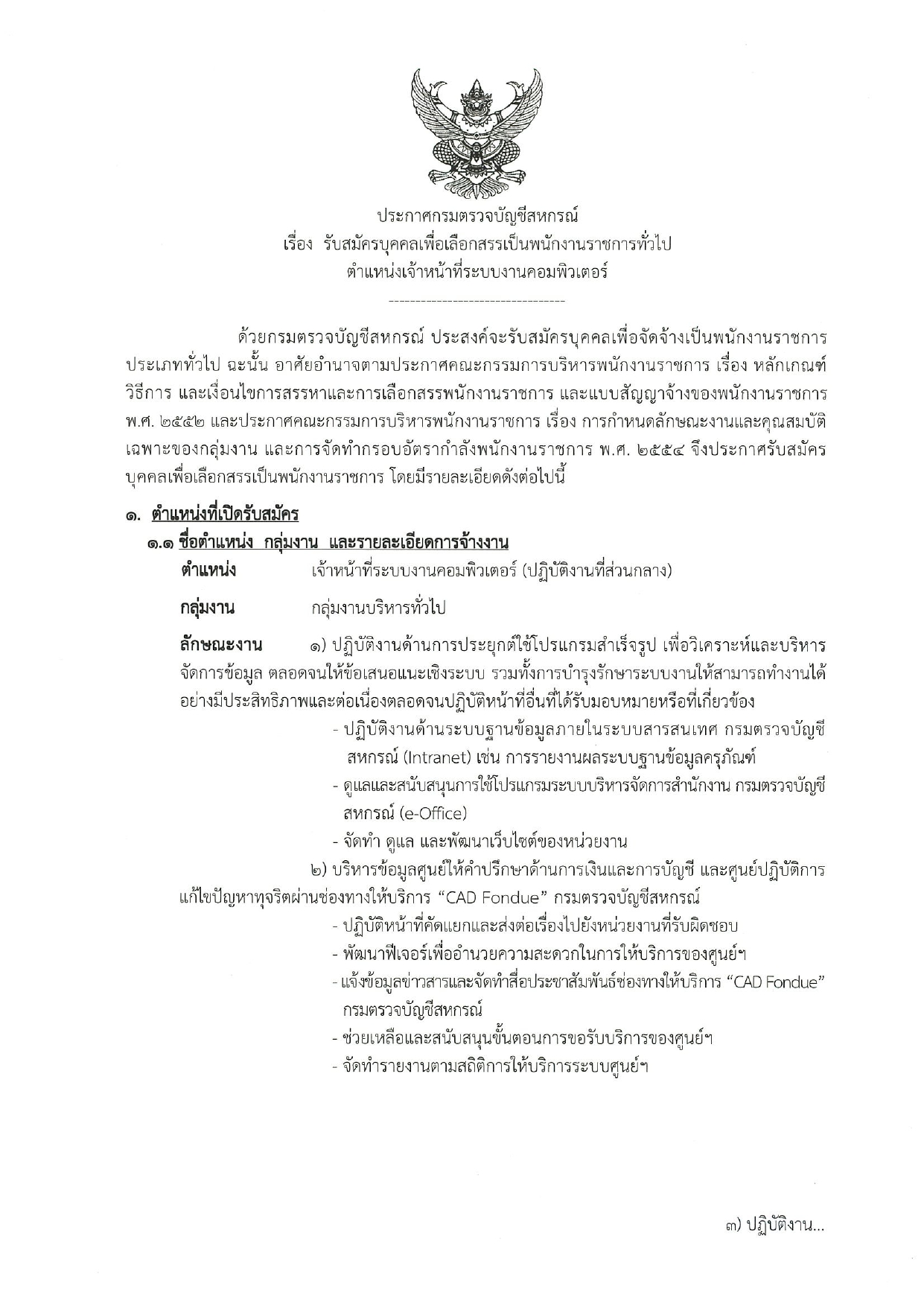 - คลิกที่นี่เพื่ออ่าน ประกาศกรมตรวจบัญชีสหกรณ์ เรื่อง รับสมัครบุคคลเพื่อเลือกสรรเป็นพนักงานราชการทั่วไป ตำแหน่งเจ้าหน้าที่ระบบงานคอมพิวเตอร์