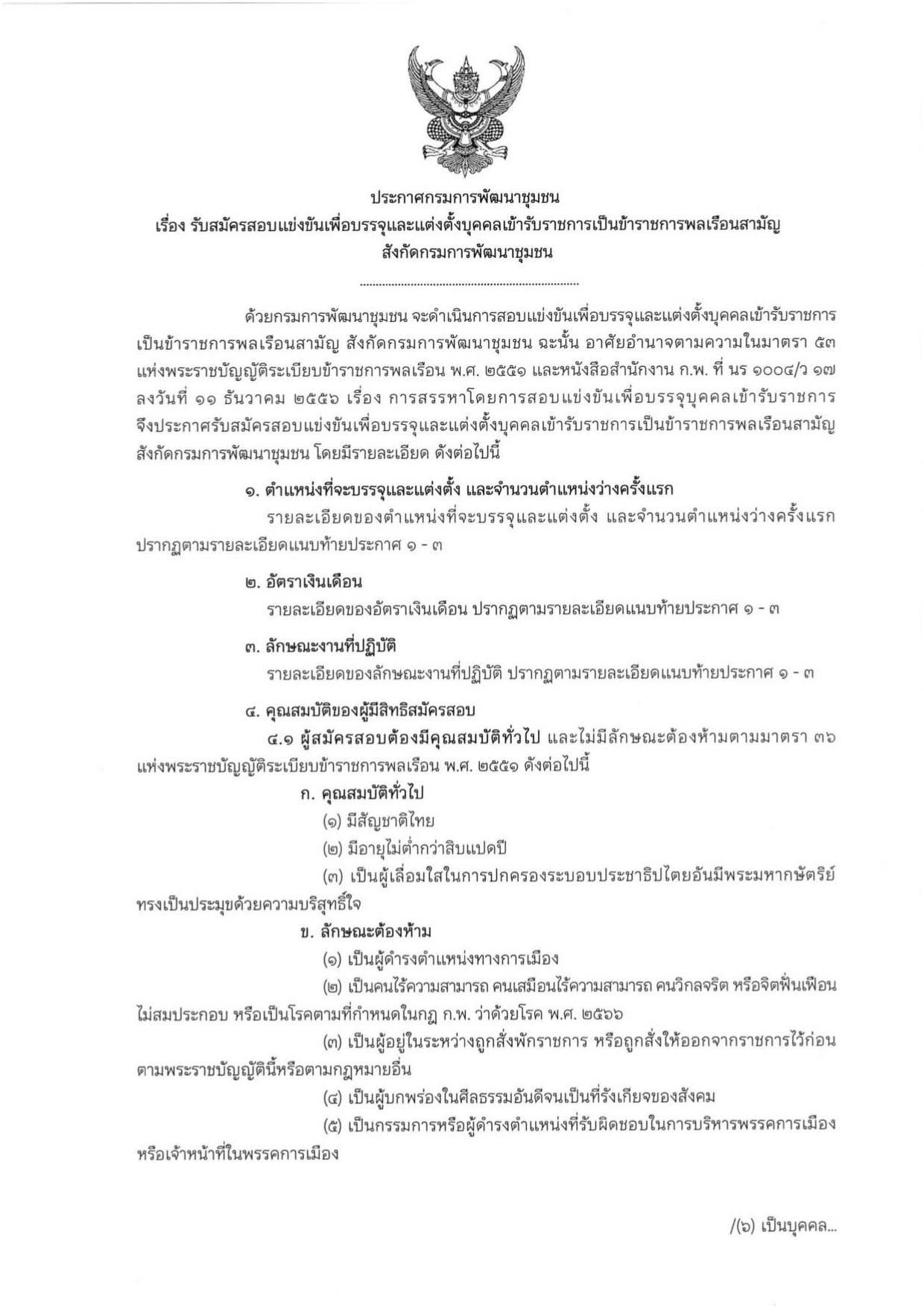 กรมการพัฒนาชุมชน ประกาศรับสมัครสอบแข่งขันเพื่อบรรจุและแต่งตั้งบุคคลเข้ารับราชการเป็นข้าราชการพลเรือนสามัญ