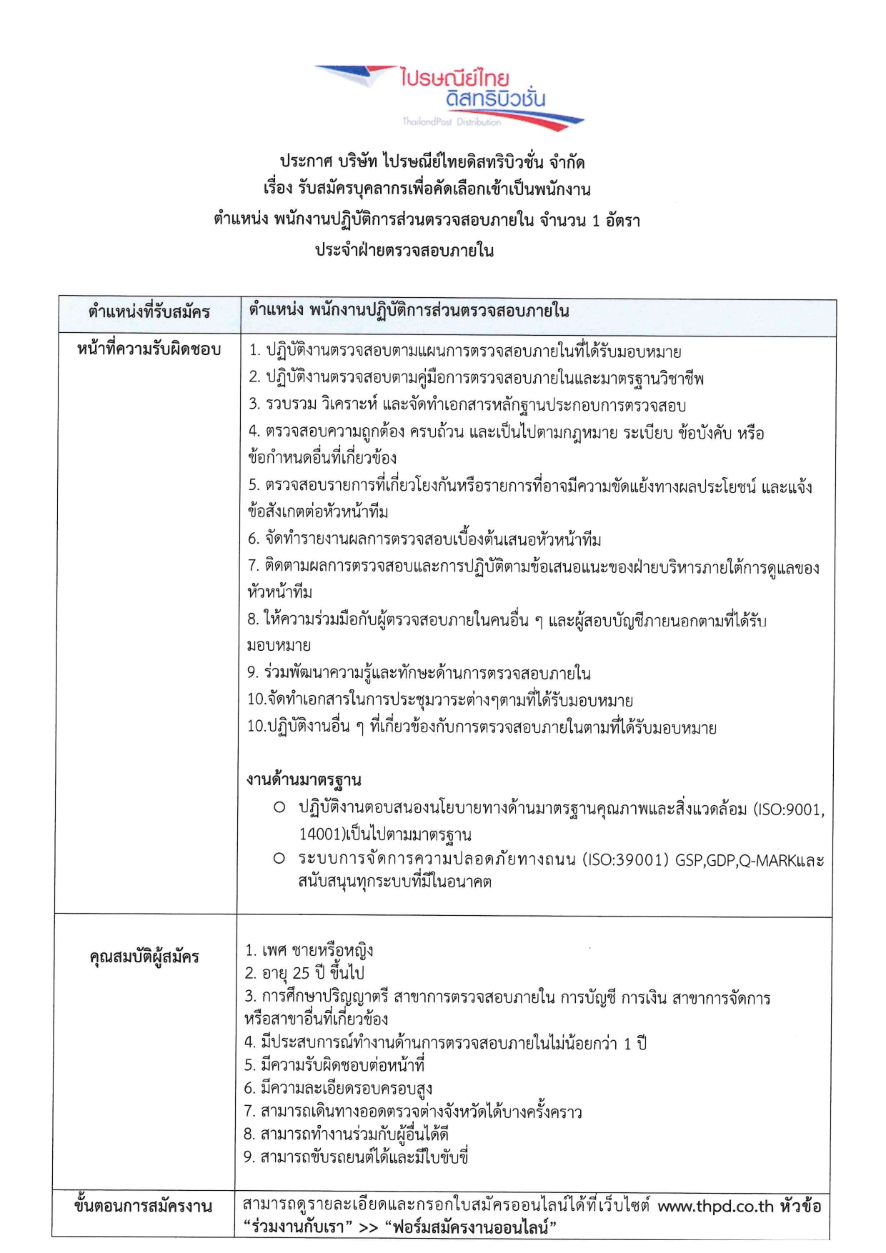 สังกัด: ฝ่ายตรวจสอบภายใน จำนวน: 1 อัตรา