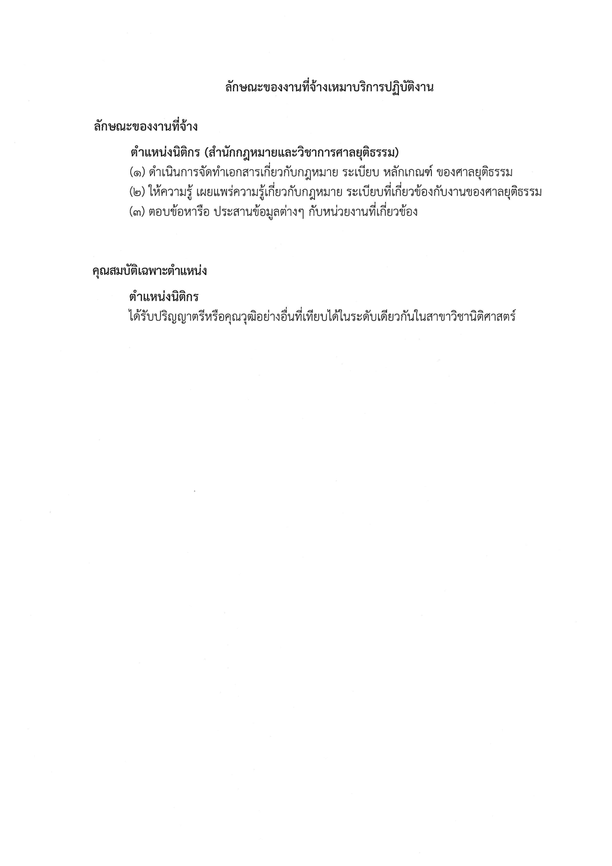 นิติกร: จัดทำเอกสารกฎหมาย/ระเบียบของศาล, ให้ความรู้กฎหมาย, ตอบข้อหารือและประสานงานหน่วยงานที่เกี่ยวข้อง