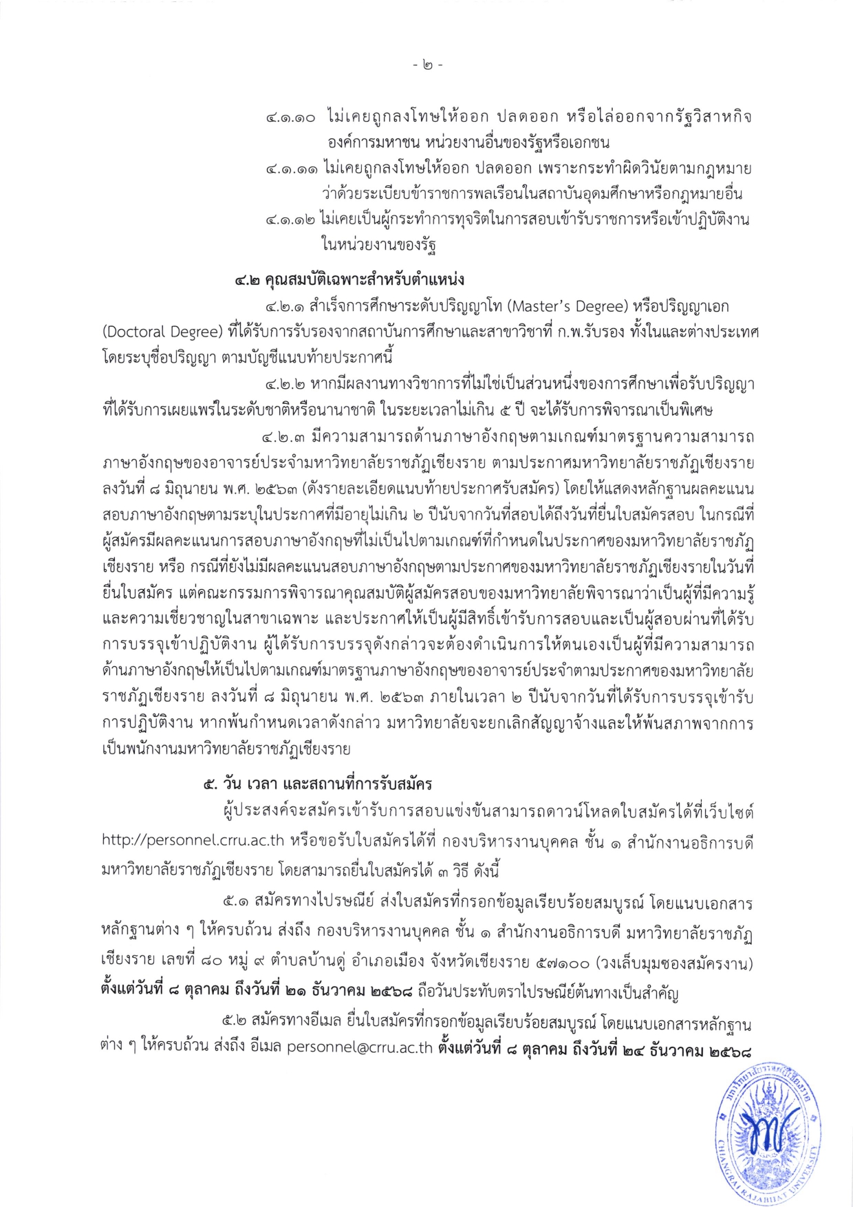 4.1 คุณสมบัติทั่วไป (สรุป) มีสัญชาติไทย อายุไม่ต่ำกว่า 18 ปีบริบูรณ์ เลื่อมใสในการปกครองระบอบประชาธิปไตยอันมีพระมหากษัตริย์เป็นประมุข ไม่เป็นผู้ดำรงตำแหน่งทางการเมือง ไม่เป็นคนวิกลจริต/จิตฟั่นเฟือน ไม่สมประกอบ/คนเสมือนไร้ความสามารถ/เป็นโรคที่กำหนดใน กฎ ก.พ.อ. ไม่อยู่ระหว่างถูกสั่งพักราชการ/ให้ออกจากราชการไว้ก่อน ไม่บกพร่องในศีลธรรมอันดี ไม่เป็นบุคคลล้มละลาย ไม่เคยถูกจำคุกโดยคำพิพากษาถึงที่สุดให้จำคุก เว้นแต่เป็นโทษสำหรับความผิดที่ได้กระทำโดยประมาทหรือลหุโทษ ไม่เคยถูกลงโทษให้ออก ปลดออก หรือไล่ออกจากรัฐวิสาหกิจ องค์การมหาชน หน่วยงานอื่นของรัฐหรือเอกชน ไม่เคยถูกลงโทษให้ออก ปลดออก เพราะกระทำผิดวินัยตามกฎหมายว่าด้วยระเบียบข้าราชการพลเรือนในสถาบันอุดมศึกษาหรือกฎหมายอื่น ไม่เคยเป็นผู้กระทำการทุจริตในการสอบเข้ารับราชการหรือเข้าปฏิบัติงานในหน่วยงานของรัฐ