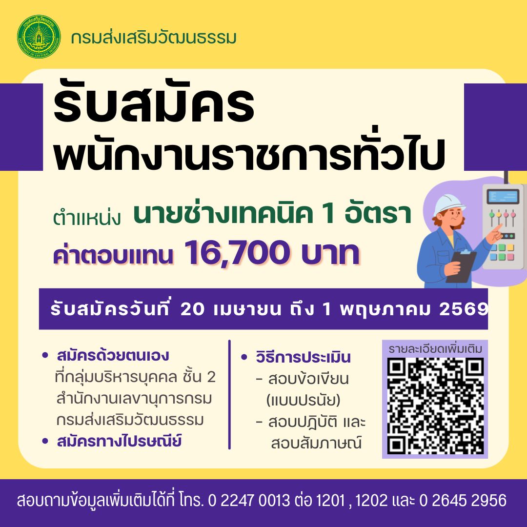 กรมส่งเสริมวัฒนธรรม รับสมัครบุคคลเพื่อเป็นพนักงานราชการ / ไม่ต้องผ่าน ภาค ก ของ กพ. / เงินเดือน 16,700 / สมัคร 20 เมษายน – 1 พฤษภาคม 2569