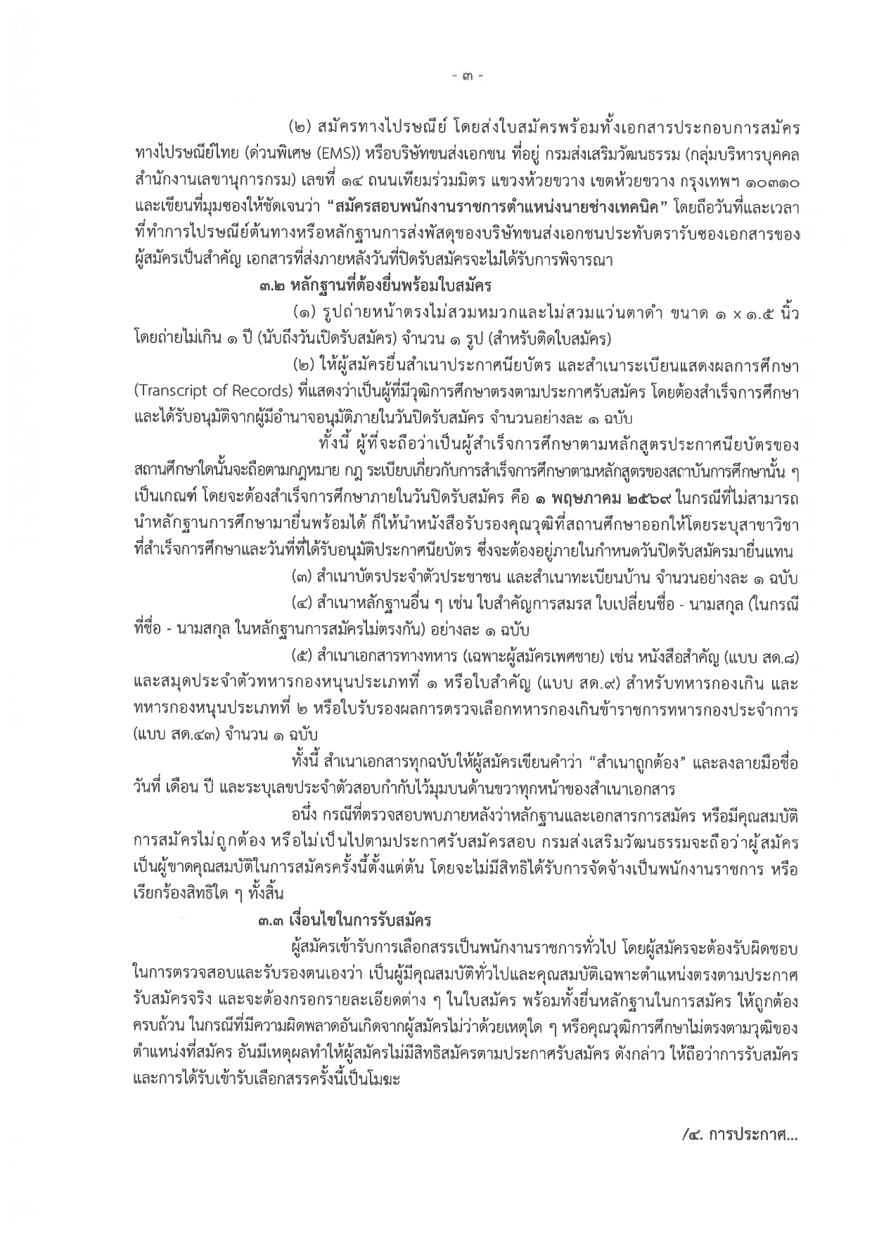 สมัครทางไปรษณีย์: ส่งใบสมัครพร้อมหลักฐานทางไปรษณีย์ด่วนพิเศษ (EMS) หรือบริษัทขนส่งเอกชน จ่าหน้าซองถึง “กลุ่มบริหารบุคคล สำนักงานเลขานุการกรม กรมส่งเสริมวัฒนธรรม เลขที่ 14 ถนนเทียมร่วมมิตร แขวงห้วยขวาง เขตห้วยขวาง กรุงเทพฯ 10310” (วงเล็บมุมซองให้ชัดเจนว่า “สมัครสอบพนักงานราชการตำแหน่งนายช่างเทคนิค” โดยจะถือวันที่ประทับตราไปรษณีย์ของบริษัทขนส่งเป็นสำคัญ)