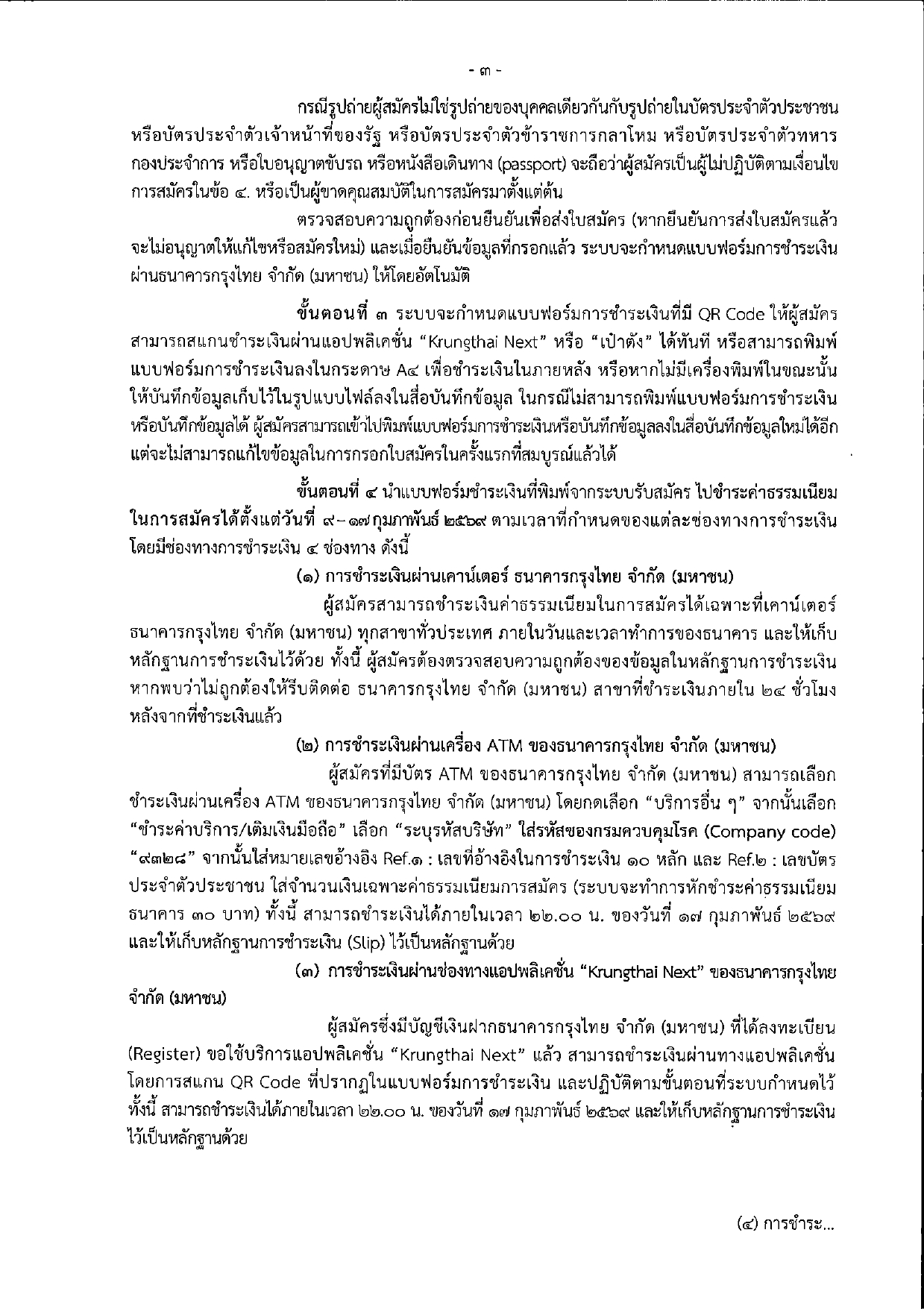 พิมพ์แบบฟอร์มเพื่อชำระเงินค่าธรรมเนียม จำนวน 430 บาท (รวมค่าบริการธนาคาร) ได้ที่เคาน์เตอร์ธนาคารกรุงไทย หรือผ่านแอปฯ Krungthai Next / เป๋าตัง ภายในวันที่ 17 กุมภาพันธ์ 2569