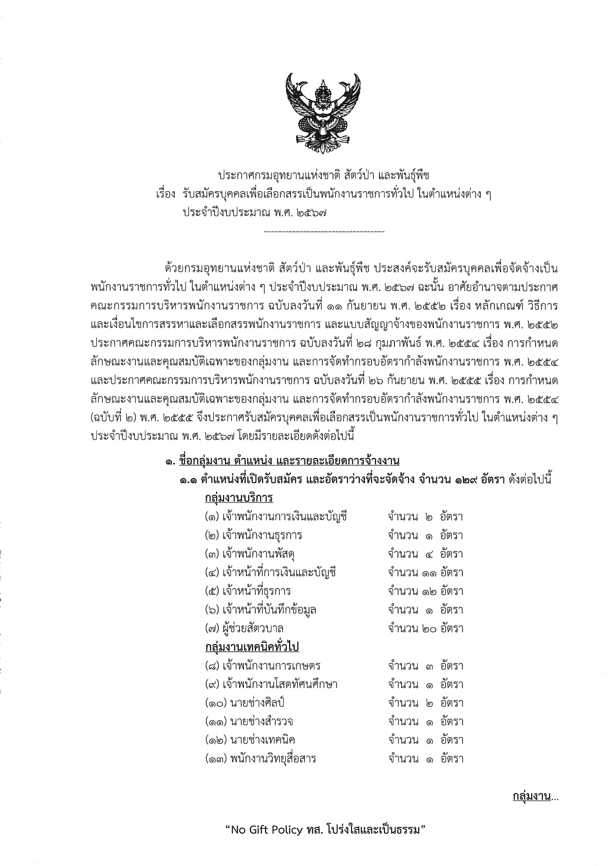 - กรมอุทยานแห่งชาติ สัตว์ป่า และพันธุ์พืช ประกาศ รับสมัครบุคคลเพื่อเลือกสรรเป็นพนักงานราชการทั่วไป ประจำปีงบประมาณ พ.ศ. 2567