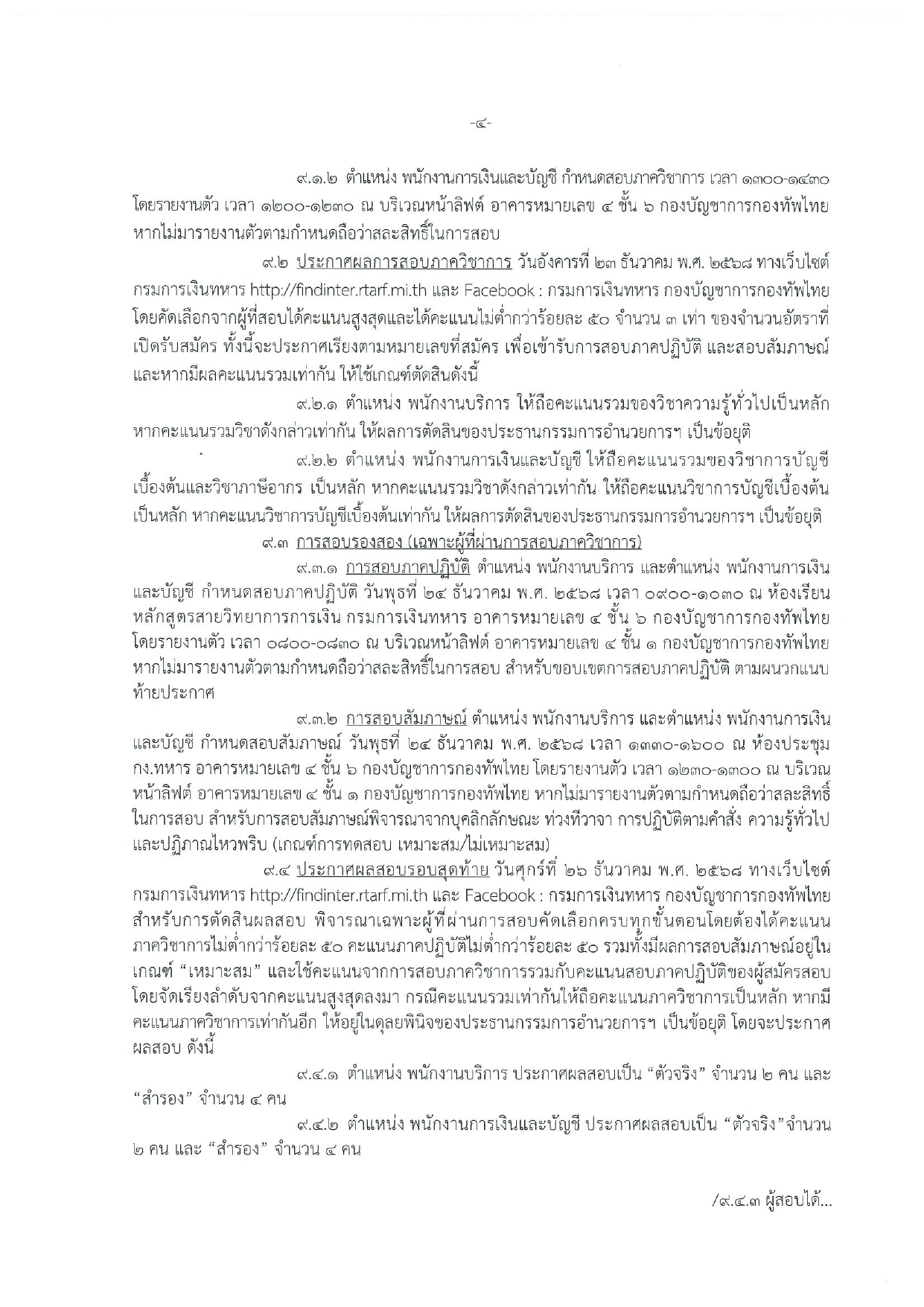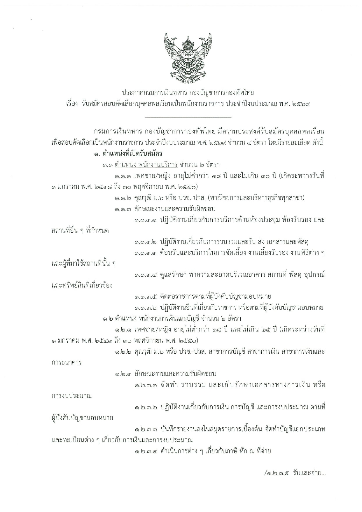 กรมการเงินทหาร กองบัญชาการกองทัพไทย มีความประสงค์จะรับสมัครบุคคลพลเรือนเพื่อสอบคัดเลือกเป็นพนักงานราชการ ประจำปีงบประมาณ พ.ศ. 2569 จำนวนรวม 4 อัตรา