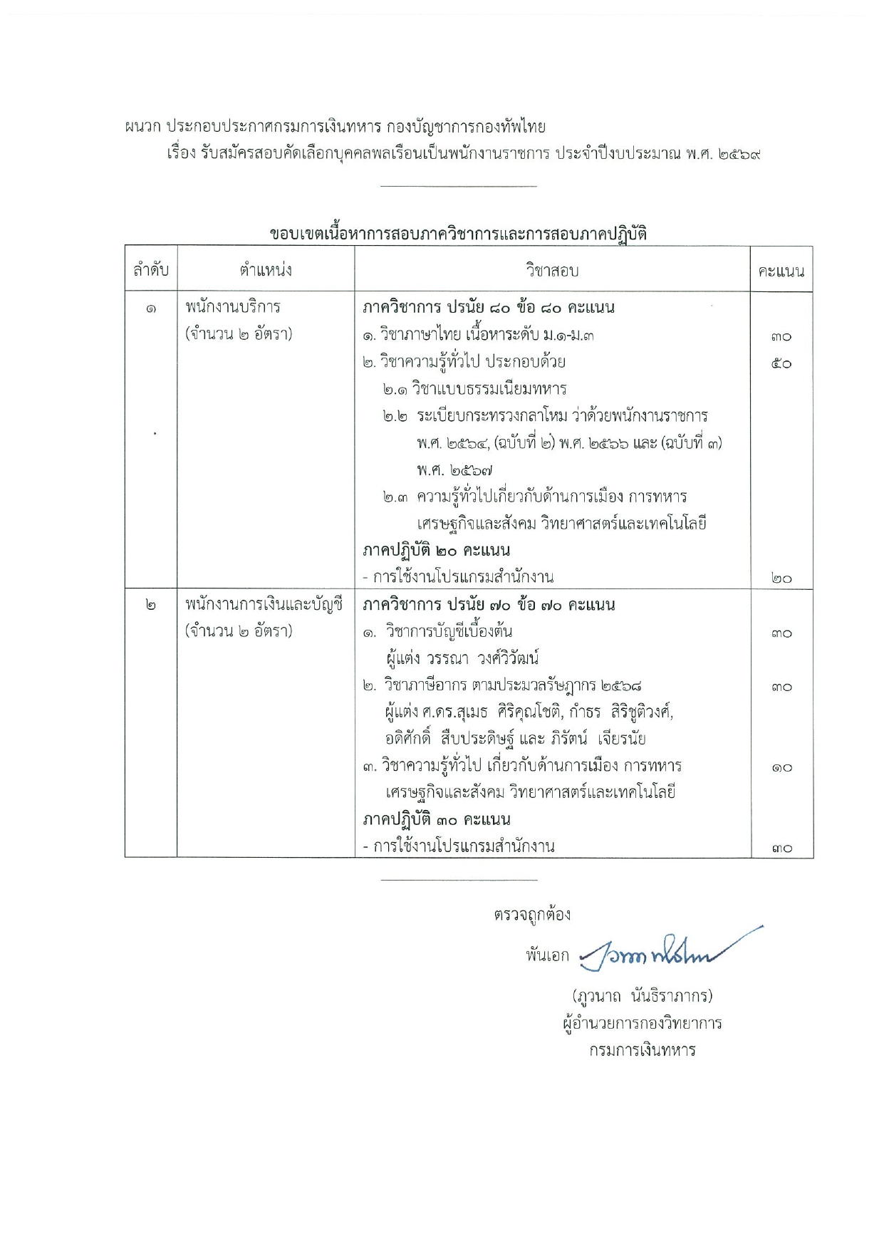 ตำแหน่งพนักงานบริการ: ทดสอบวิชาภาษาไทย (ระดับ ม.ต้น), ความรู้ทั่วไป (แบบธรรมเนียมทหาร, ระเบียบงานสารบรรณ), และการใช้งานโปรแกรมสำนักงาน
