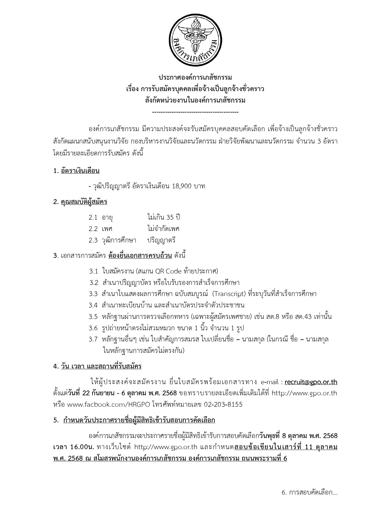 องค์การเภสัชกรรม รับสมัครบุคคลเพื่อสอบคัดเลือกเป็นลูกจ้างชั่วคราว วุฒิ ป.ตรี / ไม่ต้องผ่าน ภาค ก. / สมัคร online ถึง 6 ตุลาคม 2568