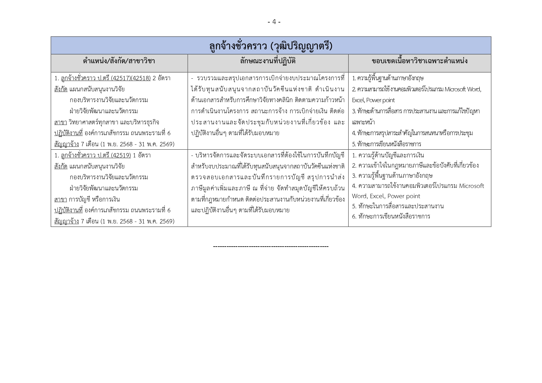 ลักษณะงาน: รวบรวมและสรุปเอกสารการเบิกจ่ายงบประมาณโครงการที่ได้รับทุนจากสถาบันวัคซีนแห่งชาติ, ดำเนินงานด้านเอกสารวิจัยทางคลินิก, ติดตามความก้าวหน้าโครงการ และประสานงานต่างๆ
