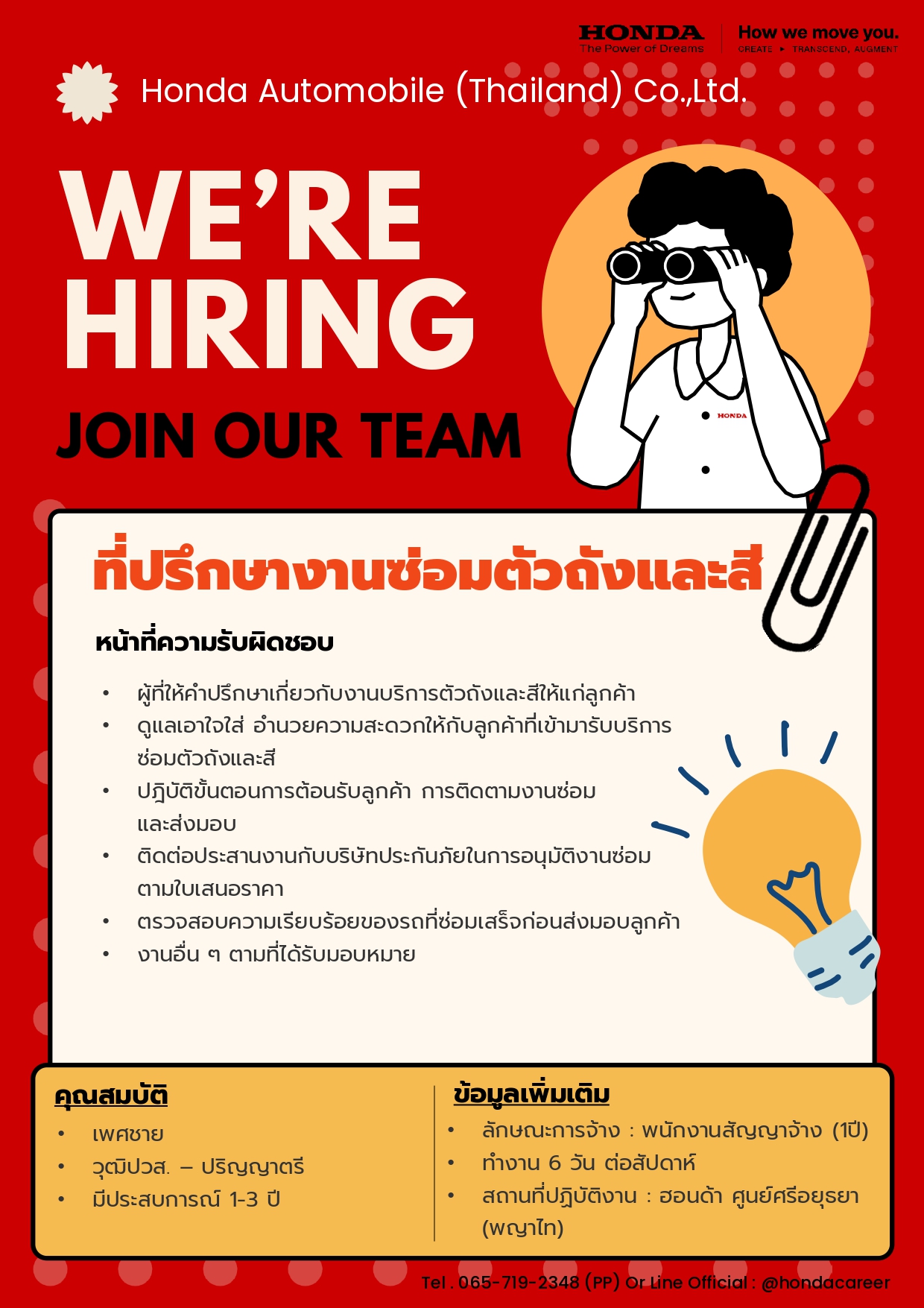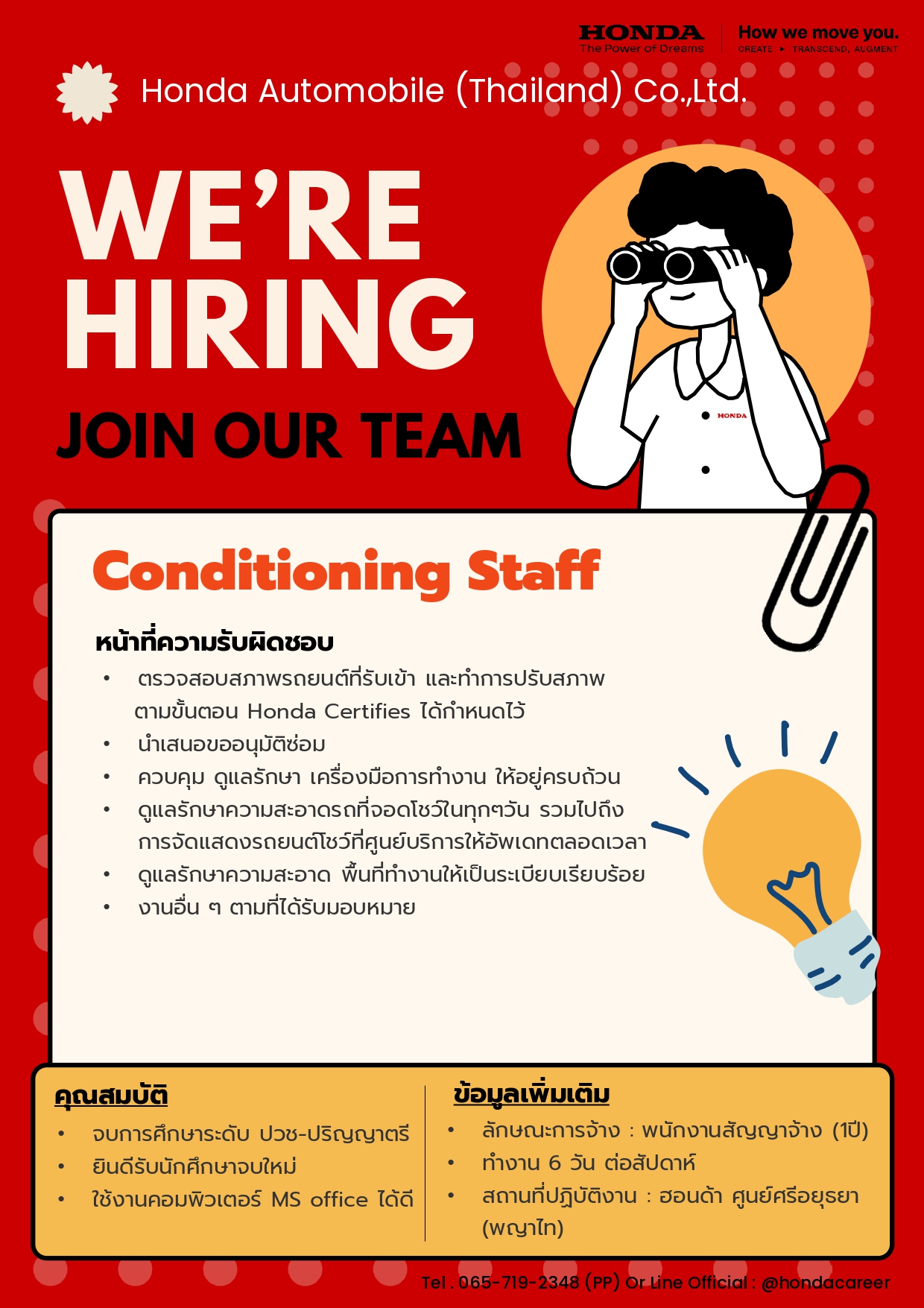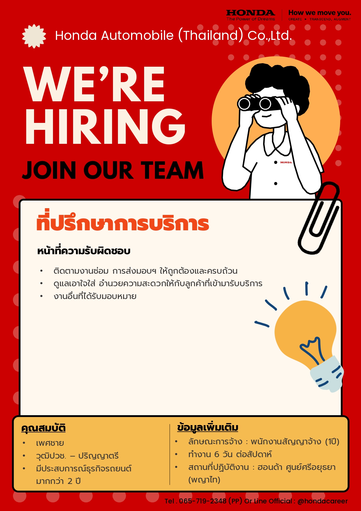 - สมัครทางอินเทอร์เน็ต และ ดูตำแหน่ง อื่น ๆได้ที่ https://www.honda.co.th/career