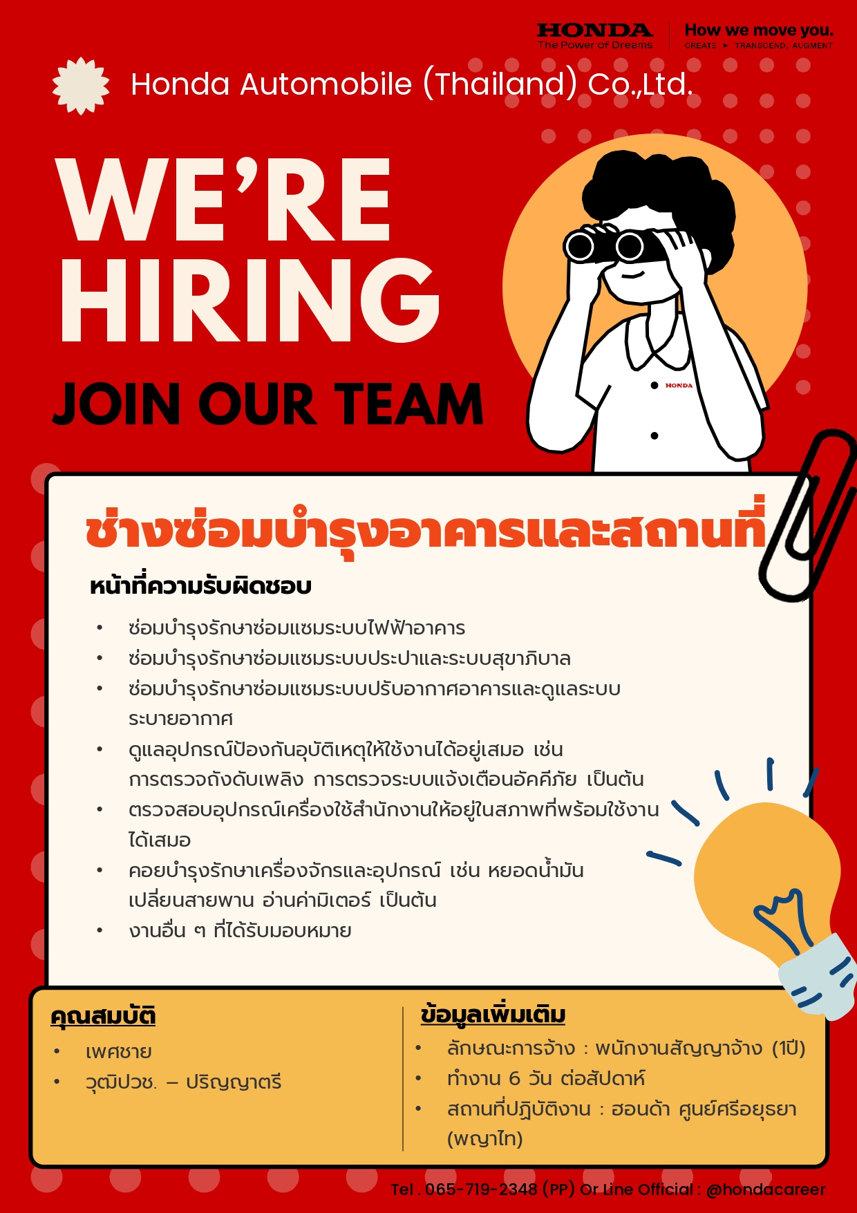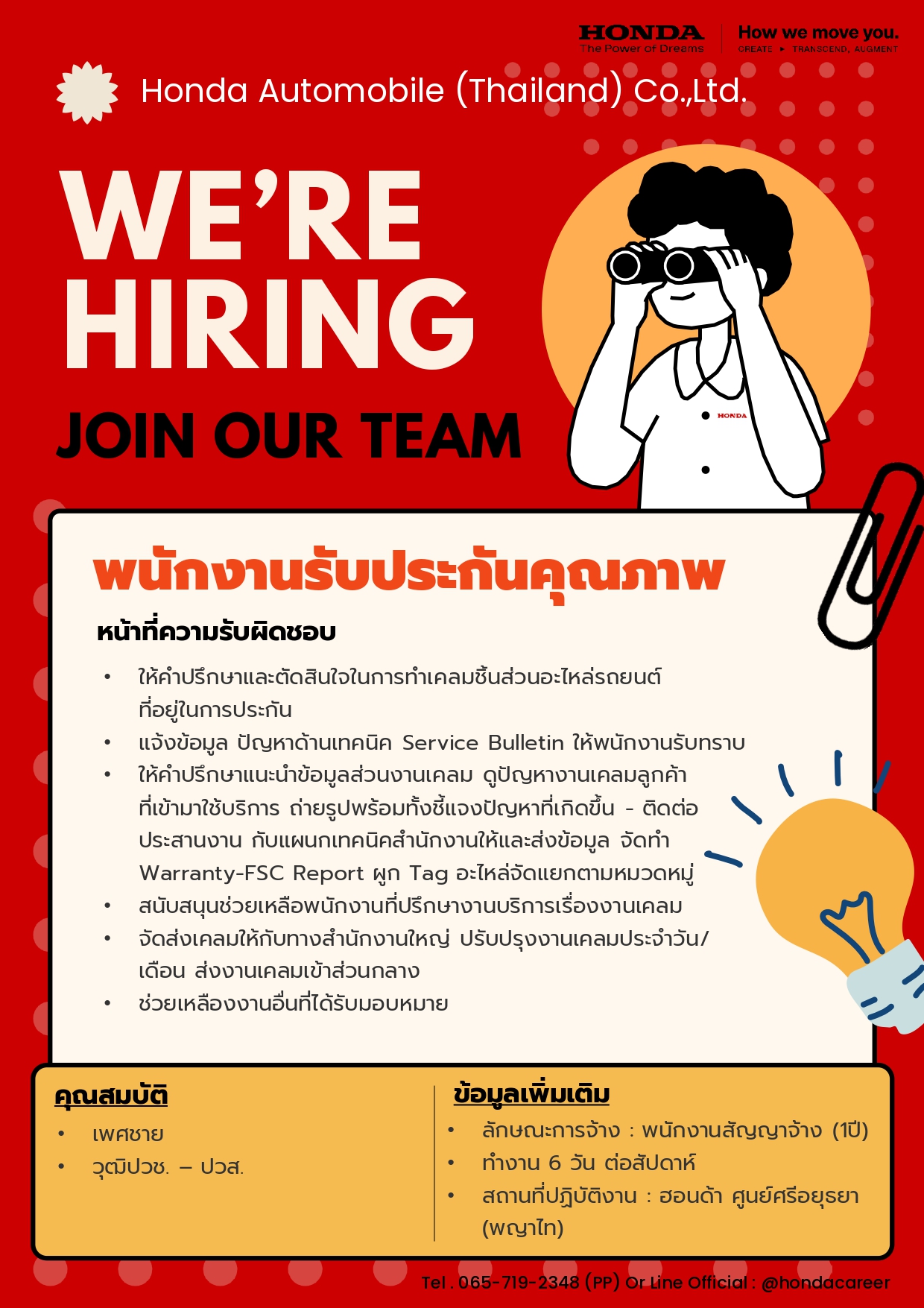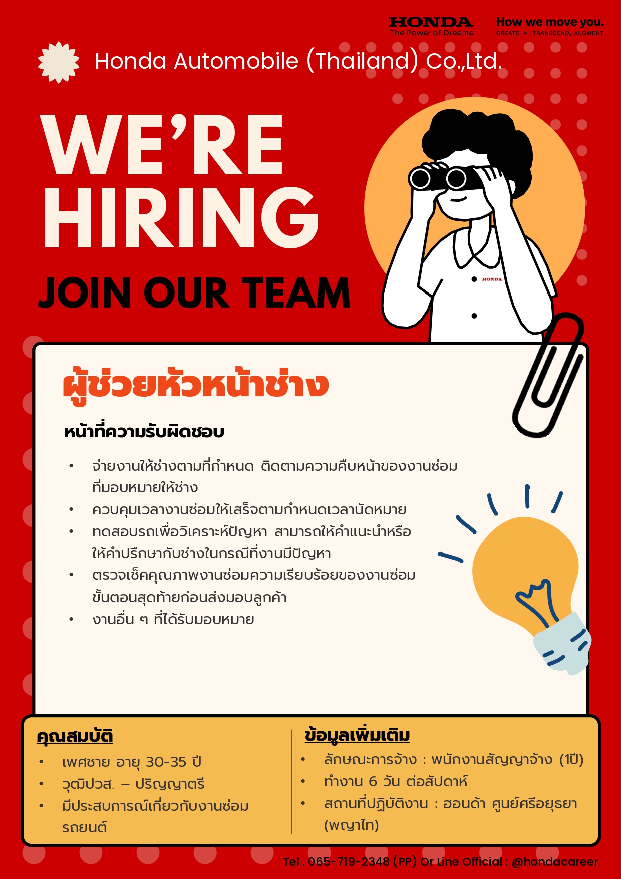 - สมัครทางอินเทอร์เน็ต และ ดูตำแหน่ง อื่น ๆได้ที่ https://www.honda.co.th/career