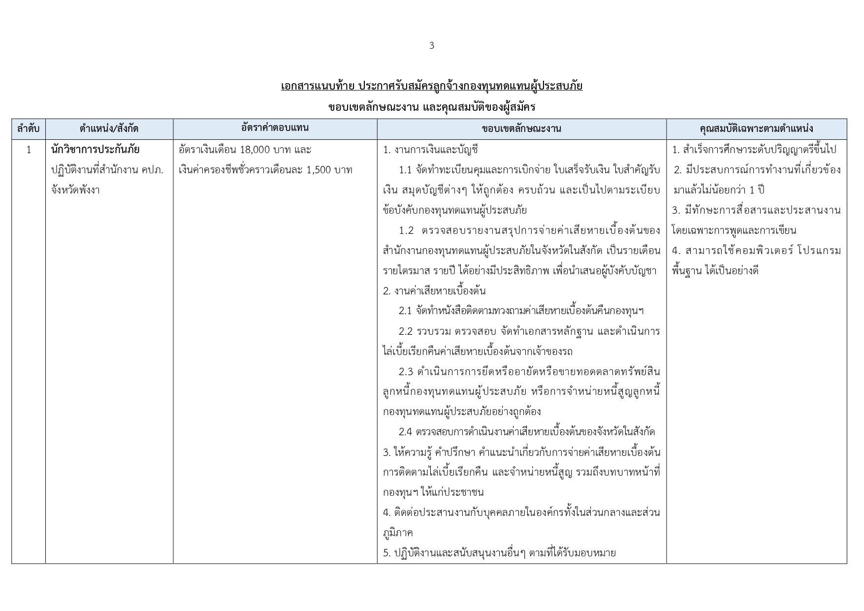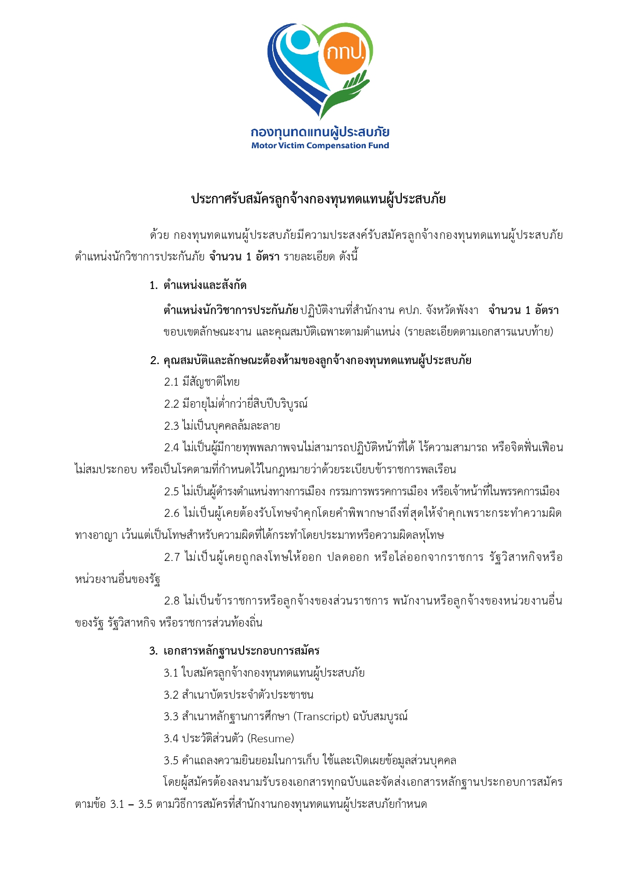 มีความประสงค์รับสมัครบุคคลเพื่อคัดเลือกเป็นลูกจ้างกองทุนฯ เพื่อปฏิบัติงานประจำ สำนักงาน คปภ. จังหวัดพังงา