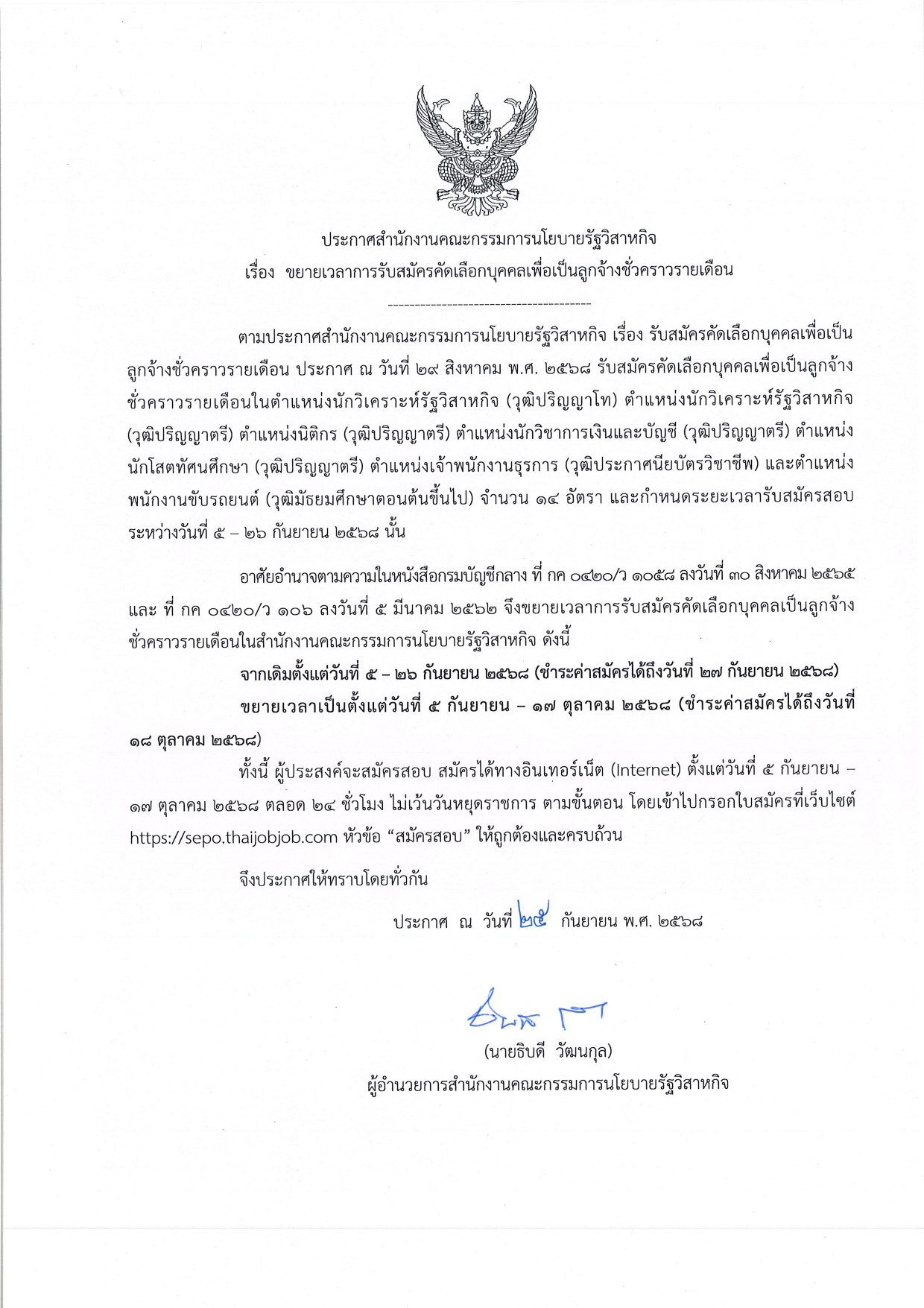 - คลิกที่นี่เพื่ออ่าน ประกาศสำนักงานคณะกรรมการนโยบายรัฐวิสาหกิจ เรื่อง ขยายเวลาการรับสมัครคัดเลือกบุคคลเพื่อเป็นลูกจ้างชั่วคราวรายเดือน