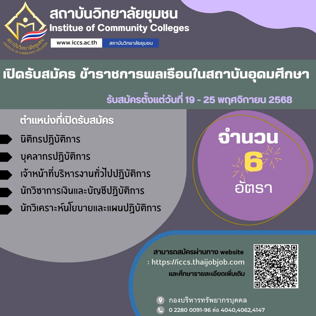 สถาบันวิทยาลัยชุมชน รับสมัครสอบแข่งขันเพื่อบรรจุและแต่งตั้งบุคคลเข้ารับราชการ หลายอัตรา / ป.ตรี หลายสาขา / ไม่ต้องผ่าน ภาค ก ของ กพ. / เงินเดือน 18150 / สมัคร online 14 ถึง 25 พฤศจิกายน 2568