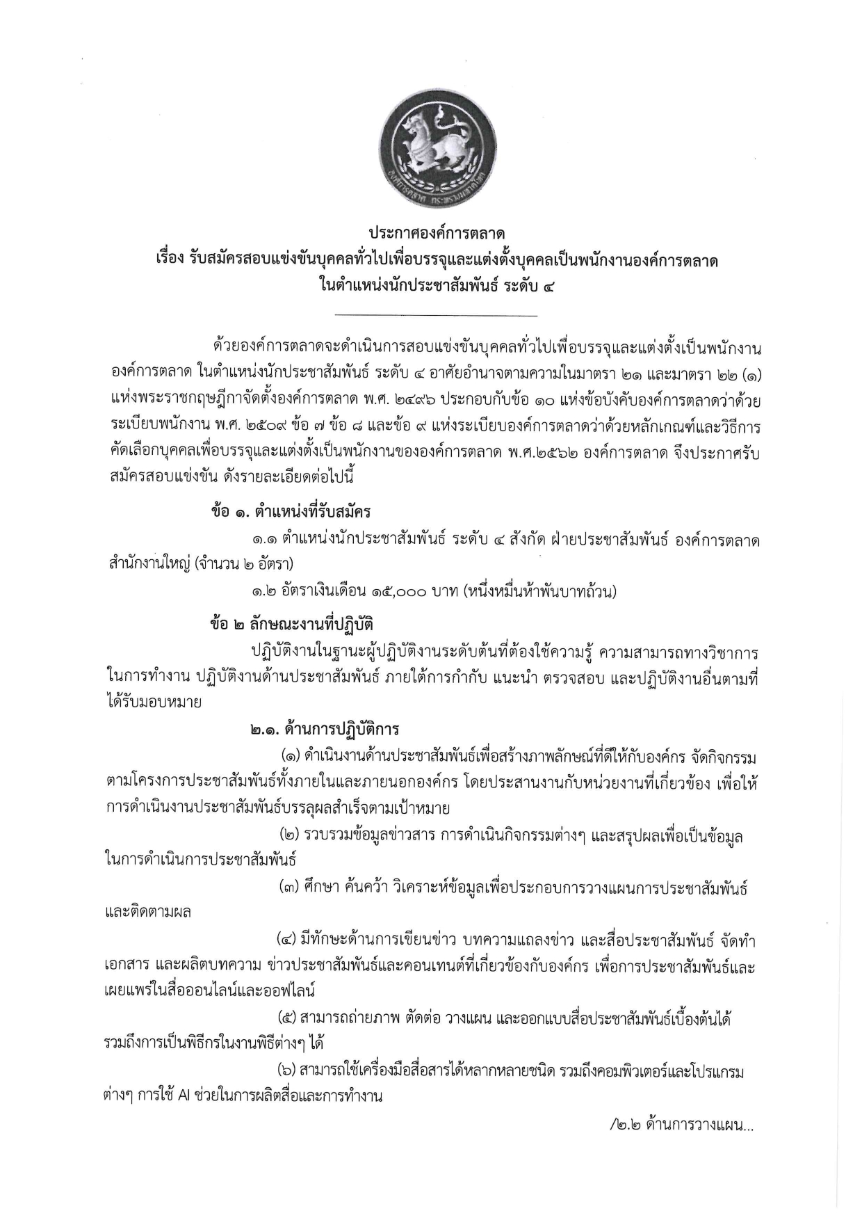 องค์การตลาดเปิดรับสมัครสอบแข่งขันบุคคลทั่วไปเพื่อบรรจุและแต่งตั้งเป็นพนักงานใน