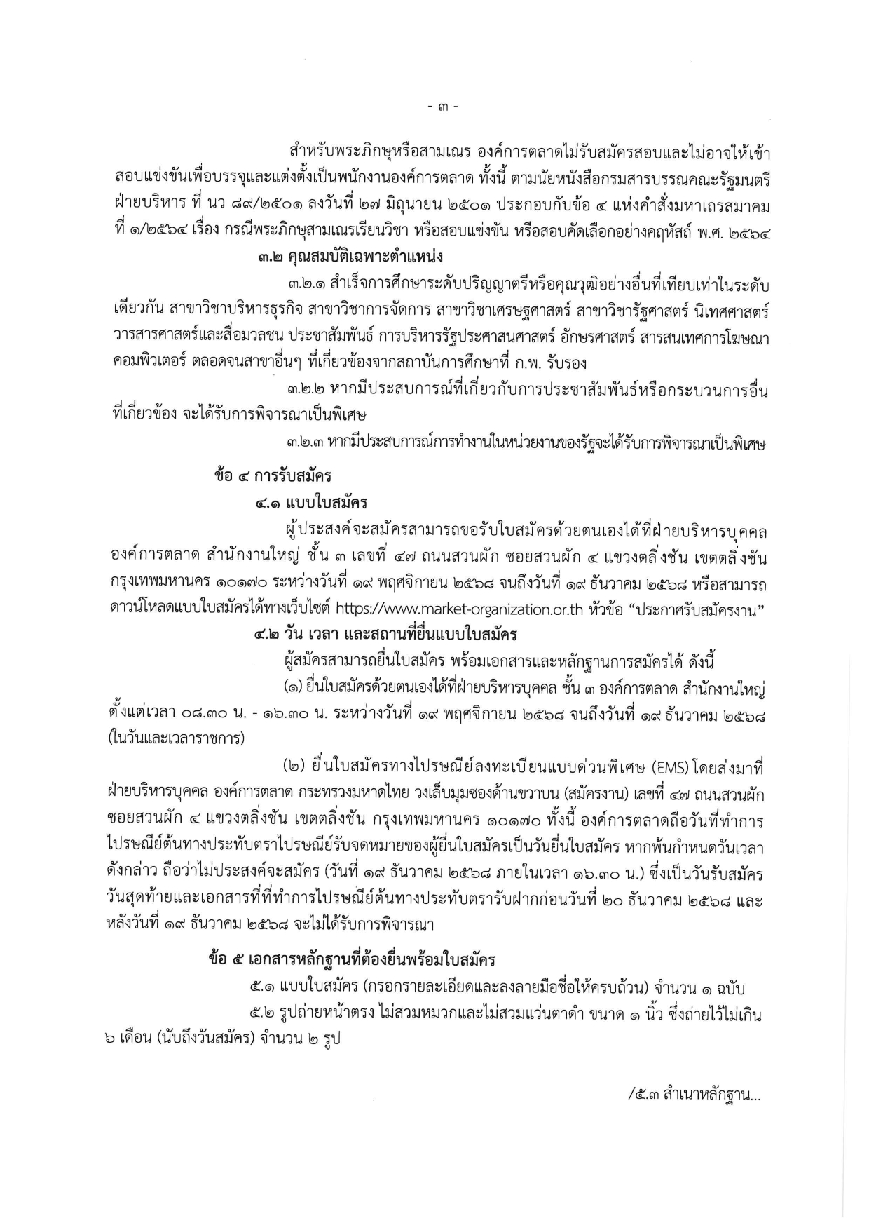 ยื่นทางไปรษณีย์ลงทะเบียนแบบด่วนพิเศษ (EMS): ส่งถึง ฝ่ายบริหารบุคคล องค์การตลาด วงเล็บมุมซองด้านขวาบน (สมัครงาน) (ถือวันที่ที่ทำการไปรษณีย์ต้นทางประทับตราก่อนวันที่ 20 ธันวาคม 2568 และภายในเวลา 16.30 น. ของวันที่ 19 ธันวาคม 2568 เป็นวันยื่นใบสมัคร)