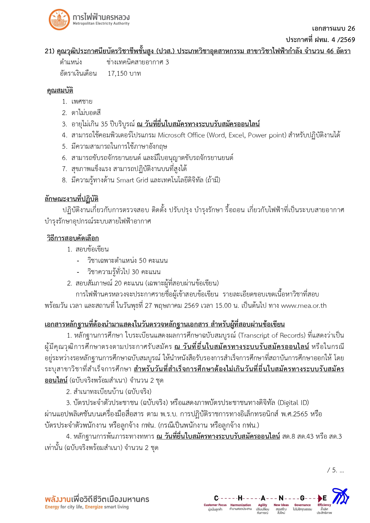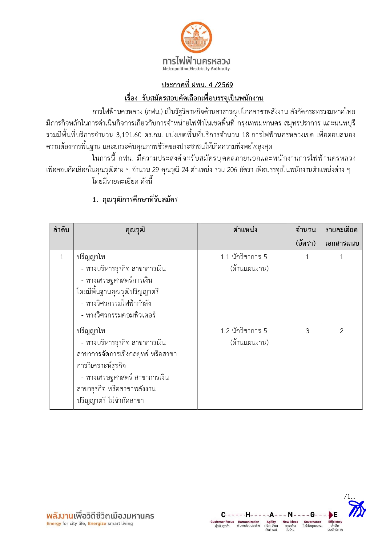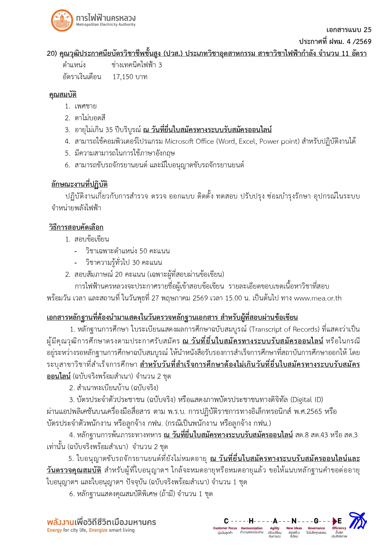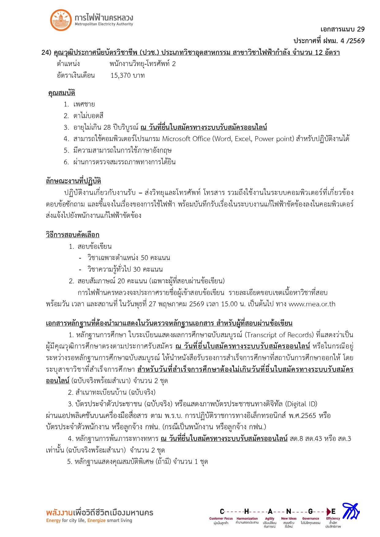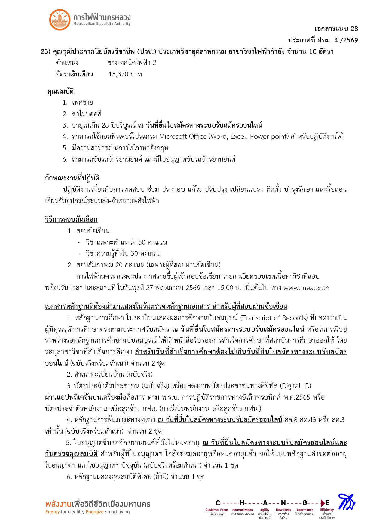 การไฟฟ้านครหลวง เปิดรับสมัครสอบคัดเลือกเพื่อบรรจุเป็นพนักงานประจำปี 2569 จำนวน 206 อัตรา หลายตำแหน่ง / ปวช. ปวส. ป.ตรี หลายสาขา + / สมัคร online 30 เม.ย. – 6 พ.ค. 2569