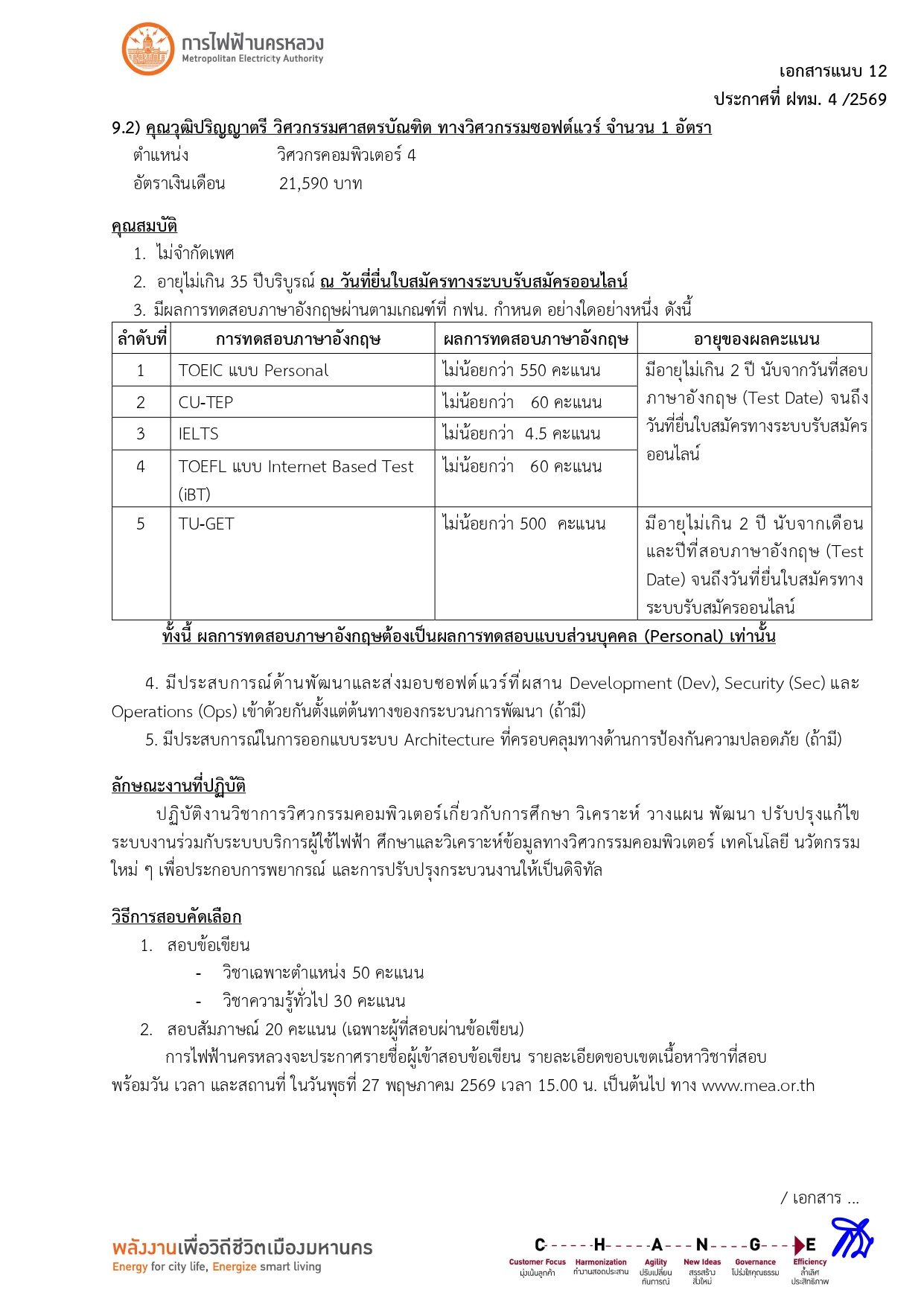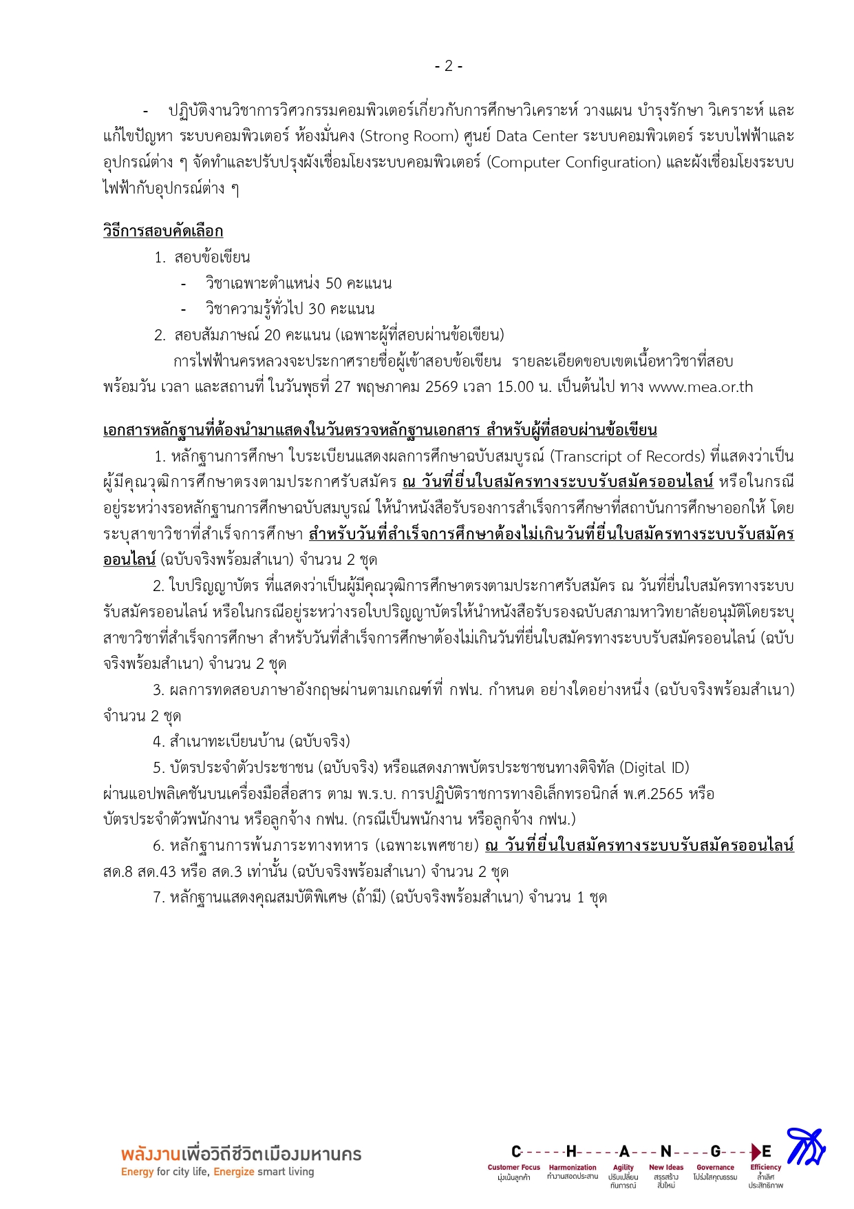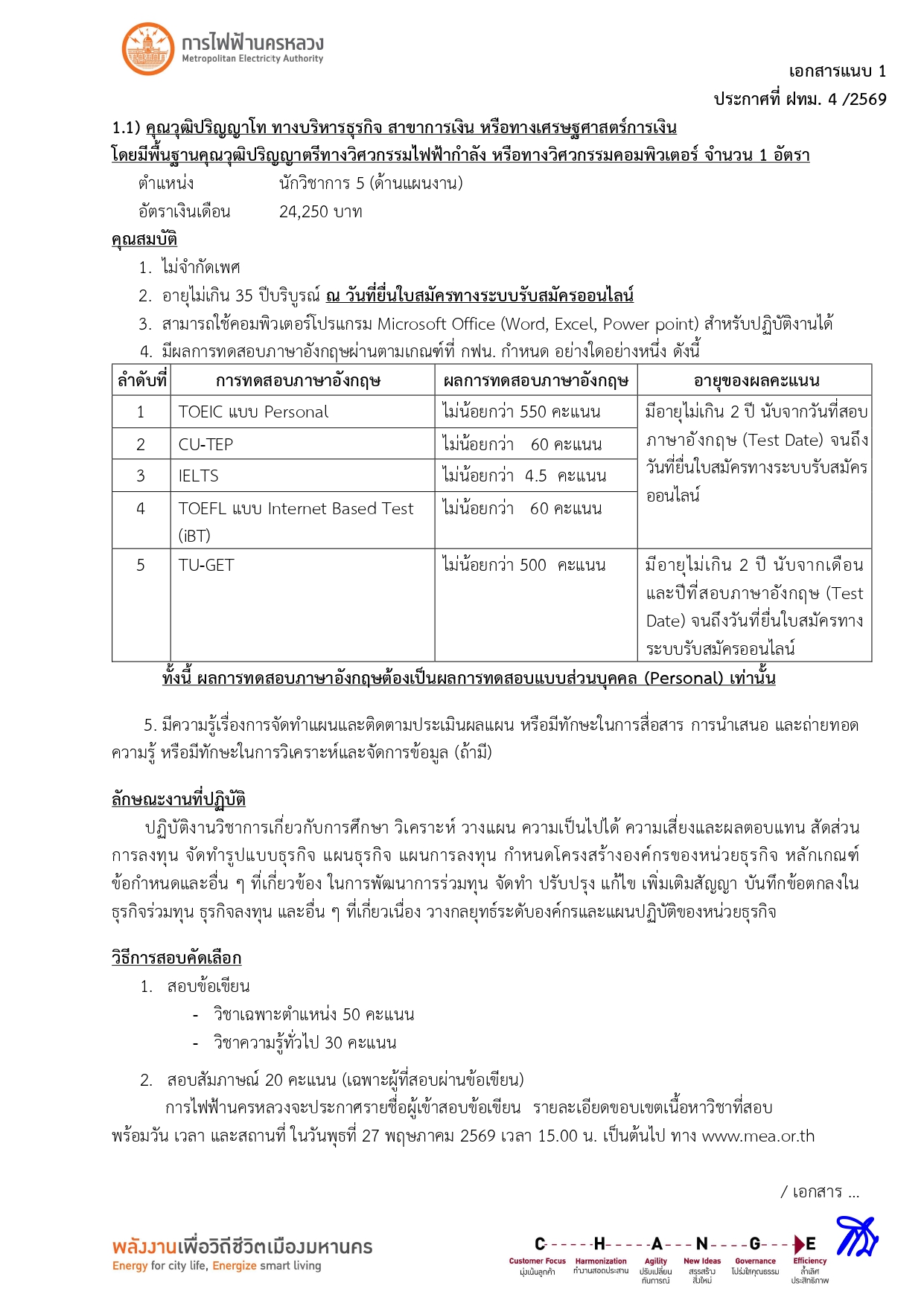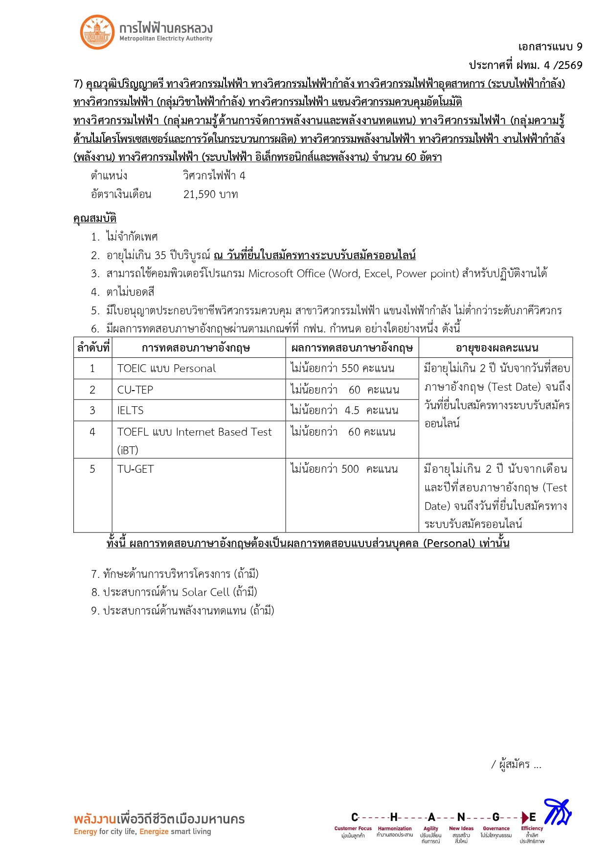 การไฟฟ้านครหลวง เปิดรับสมัครสอบคัดเลือกเพื่อบรรจุเป็นพนักงานประจำปี 2569 จำนวน 206 อัตรา หลายตำแหน่ง / ปวช. ปวส. ป.ตรี หลายสาขา + / สมัคร online 30 เม.ย. – 6 พ.ค. 2569