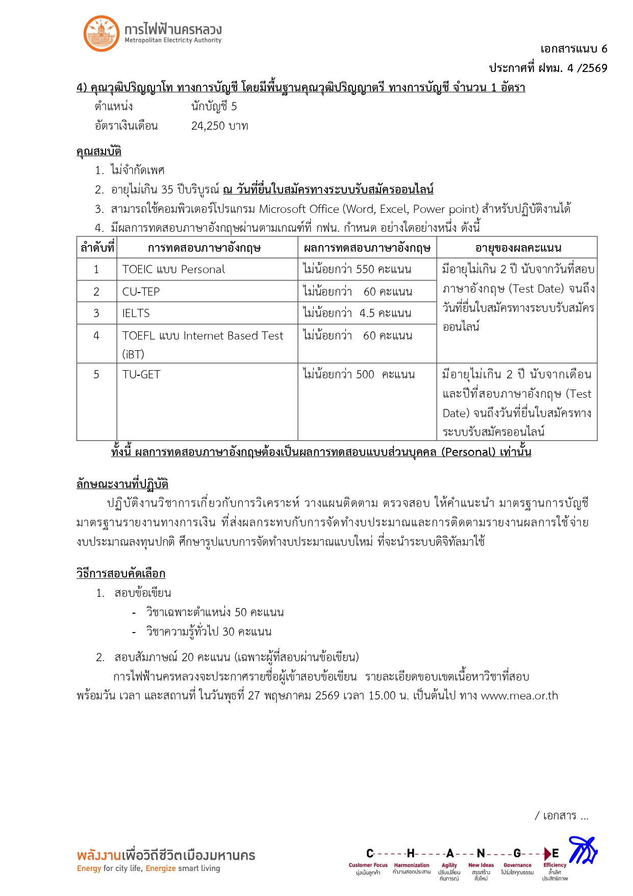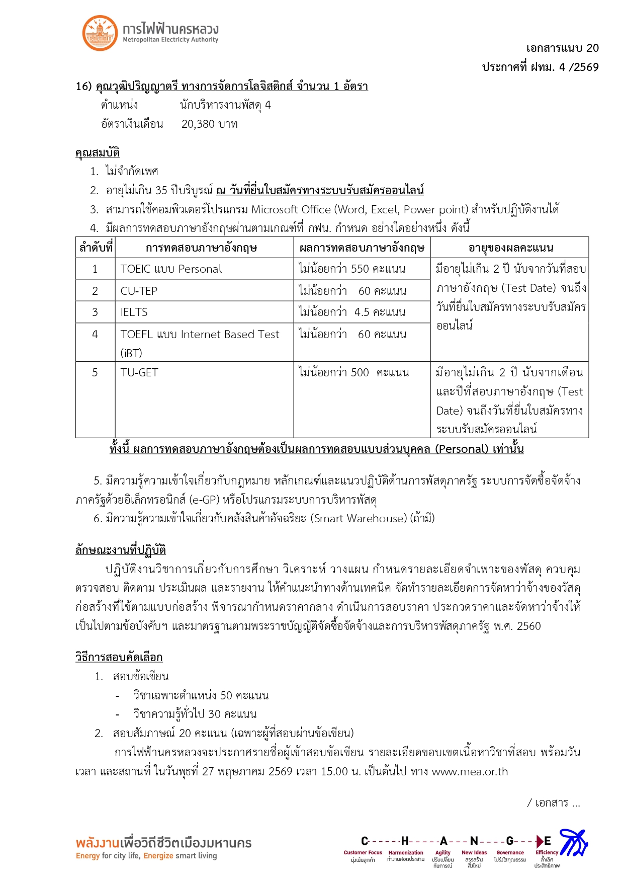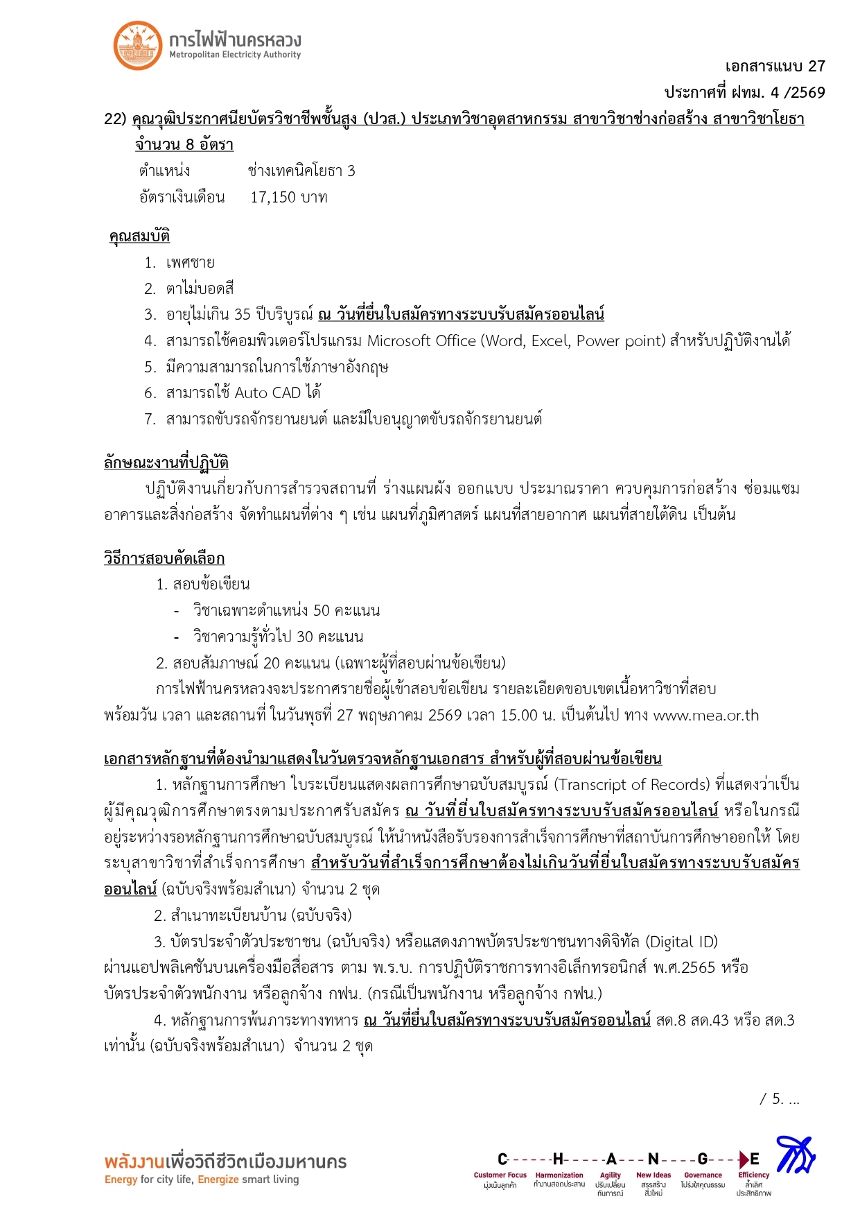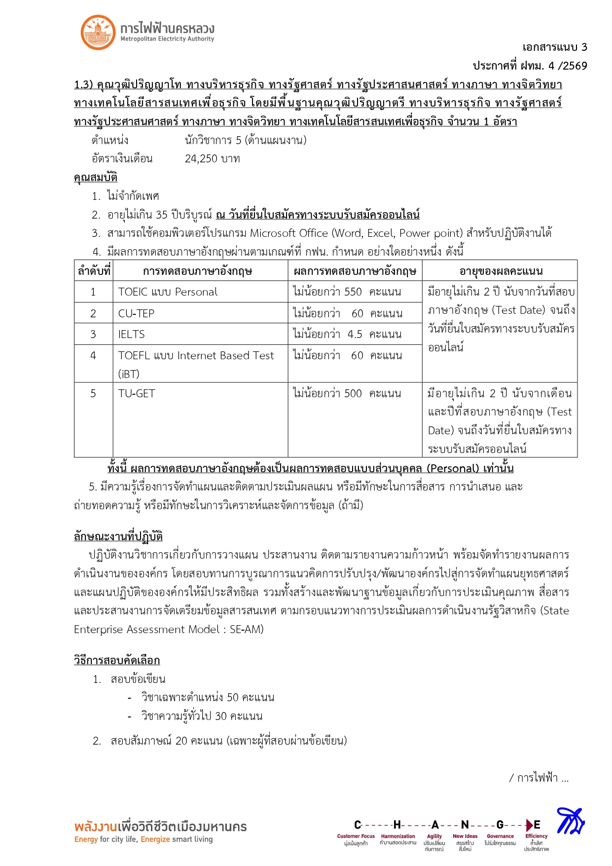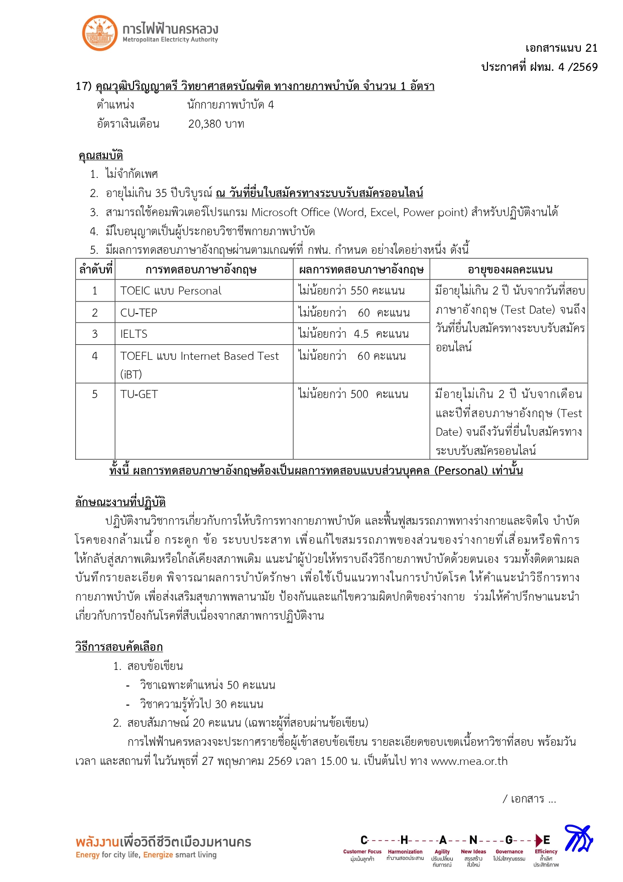 การไฟฟ้านครหลวง เปิดรับสมัครสอบคัดเลือกเพื่อบรรจุเป็นพนักงานประจำปี 2569 จำนวน 206 อัตรา หลายตำแหน่ง / ปวช. ปวส. ป.ตรี หลายสาขา + / สมัคร online 30 เม.ย. – 6 พ.ค. 2569