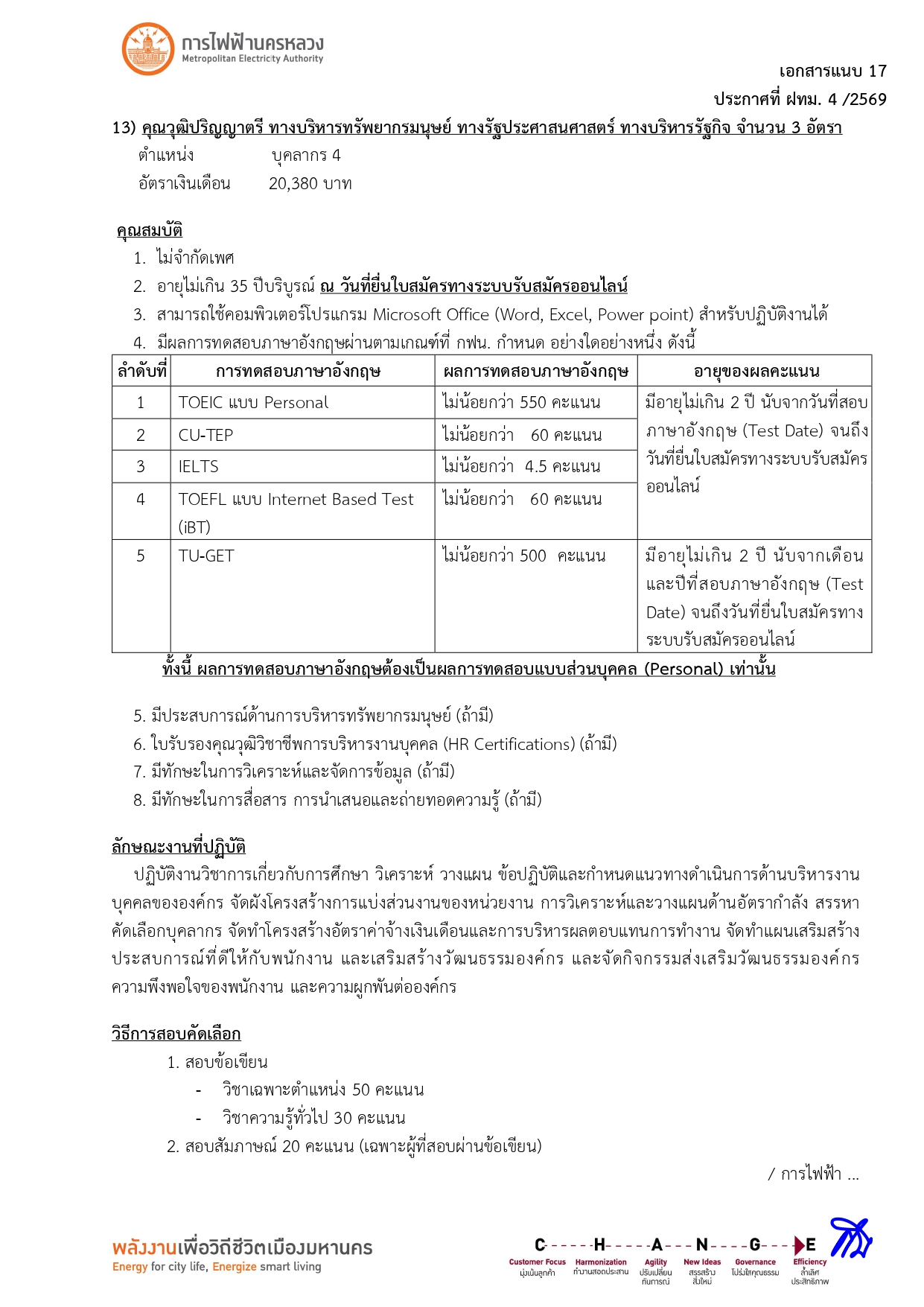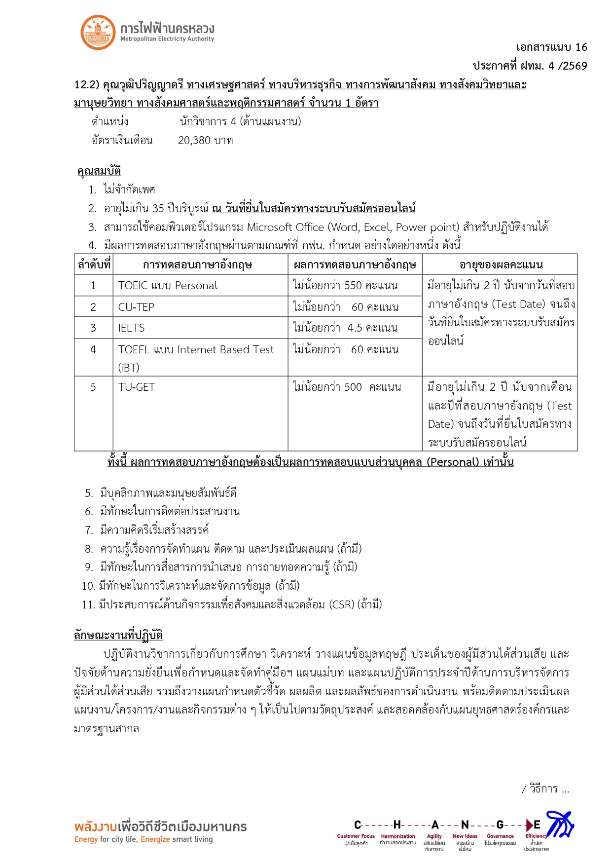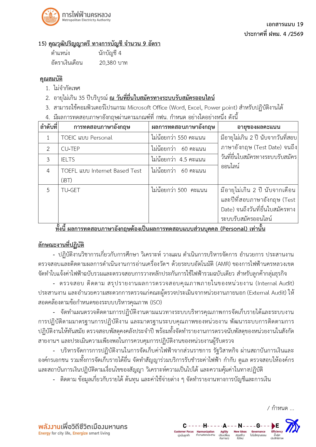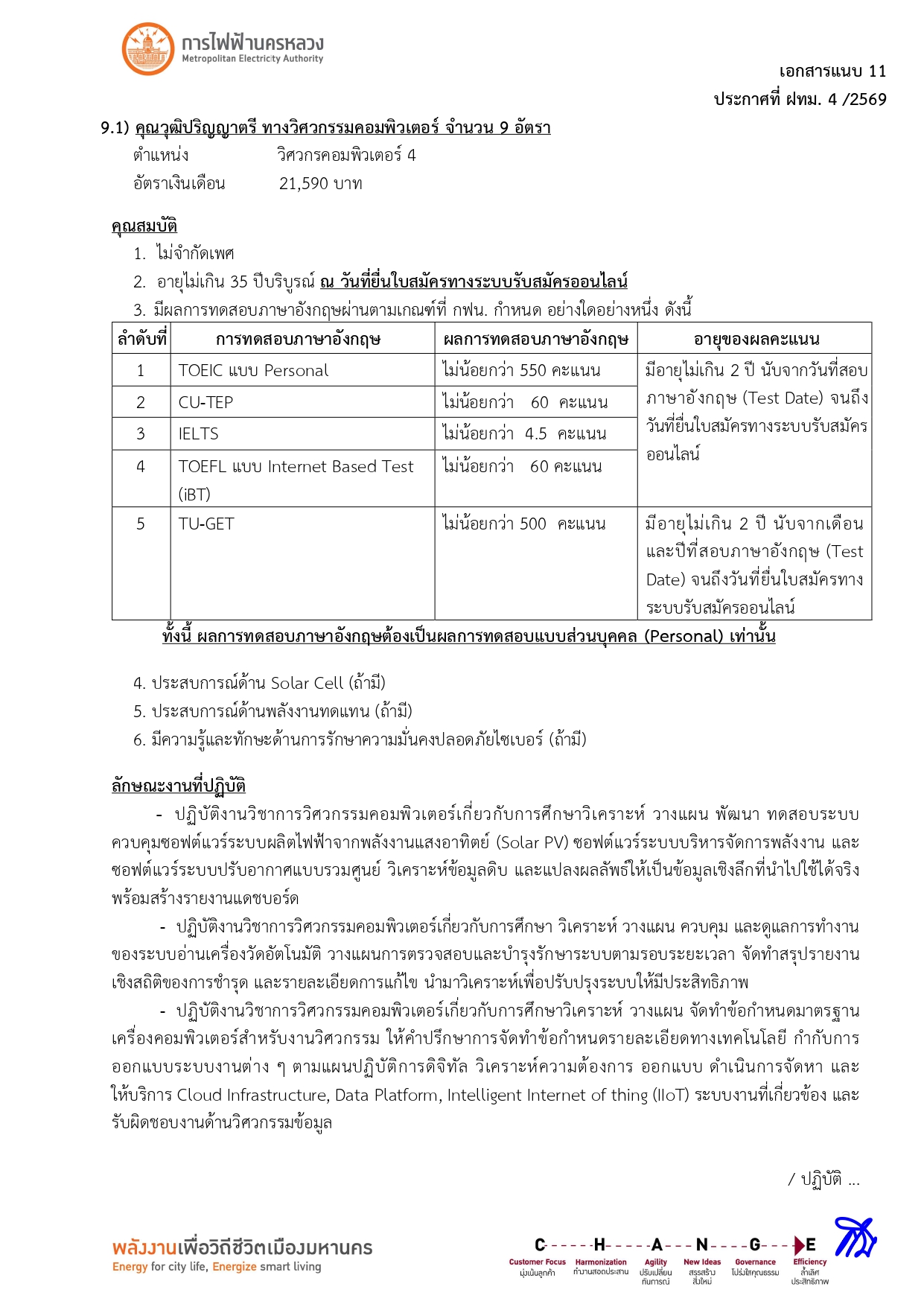การไฟฟ้านครหลวง เปิดรับสมัครสอบคัดเลือกเพื่อบรรจุเป็นพนักงานประจำปี 2569 จำนวน 206 อัตรา หลายตำแหน่ง / ปวช. ปวส. ป.ตรี หลายสาขา + / สมัคร online 30 เม.ย. – 6 พ.ค. 2569