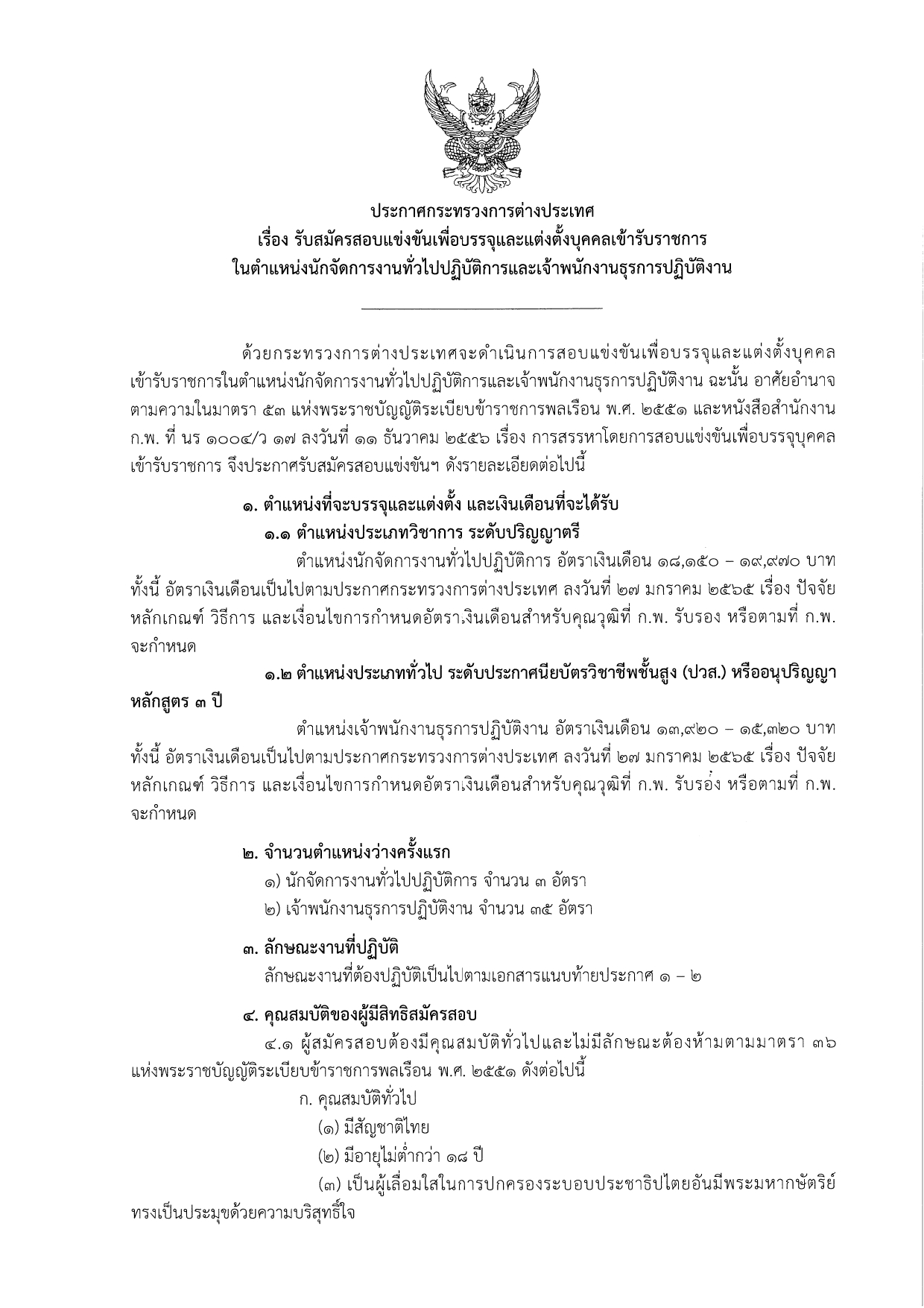 คลิกที่นี่เพื่ออ่าน ประกาศกระทรวงการต่างประเทศ เรื่อง รับสมัครสอบแข่งขันเพื่อบรรจุและแต่งตั้งบุคคลเข้ารับราชการ ในตำแหน่งนักจัดการงานทั่วไปปฏิบัติการและเจ้าพนักงานธุรการปฏิบัติงาน
