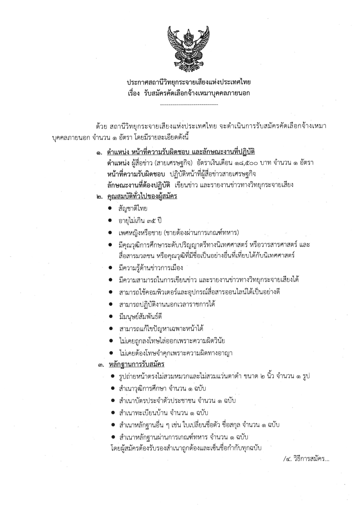 สถานีวิทยุกระจายเสียงแห่งประเทศไทย จะดำเนินการรับสมัครคัดเลือกจ้างเหมาบุคคลภายนอก