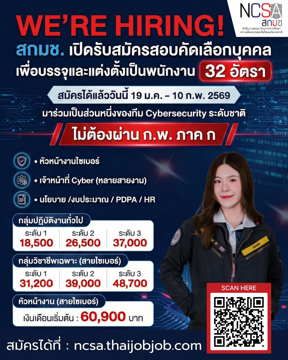 สำนักงานคณะกรรมการการรักษาความมั่นคงปลอดภัยไซเบอร์แห่งชาติ รับสมัครสอบคัดเลือกบุคคลเพื่อบรรจุและแต่งตั้งเป็นพนักงาน 32 อัตรา ป.ตรี หลายสาขา / เงินเดือนสูงสุด 60,000+ / ไม่ต้องผ่าน ภาค ก. / สมัครออนไลน์ 19 ม.ค. – 10 ก.พ. 69