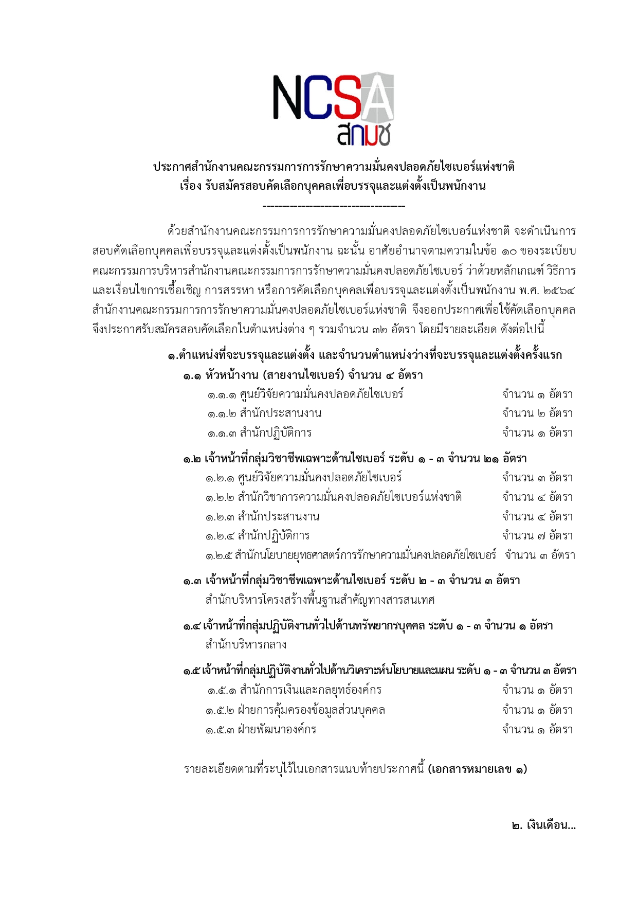 สกมช. (NCSA) เปิดรับสมัครพนักงาน 32 อัตรา (เงินเดือนสูงสุด 60,000+)