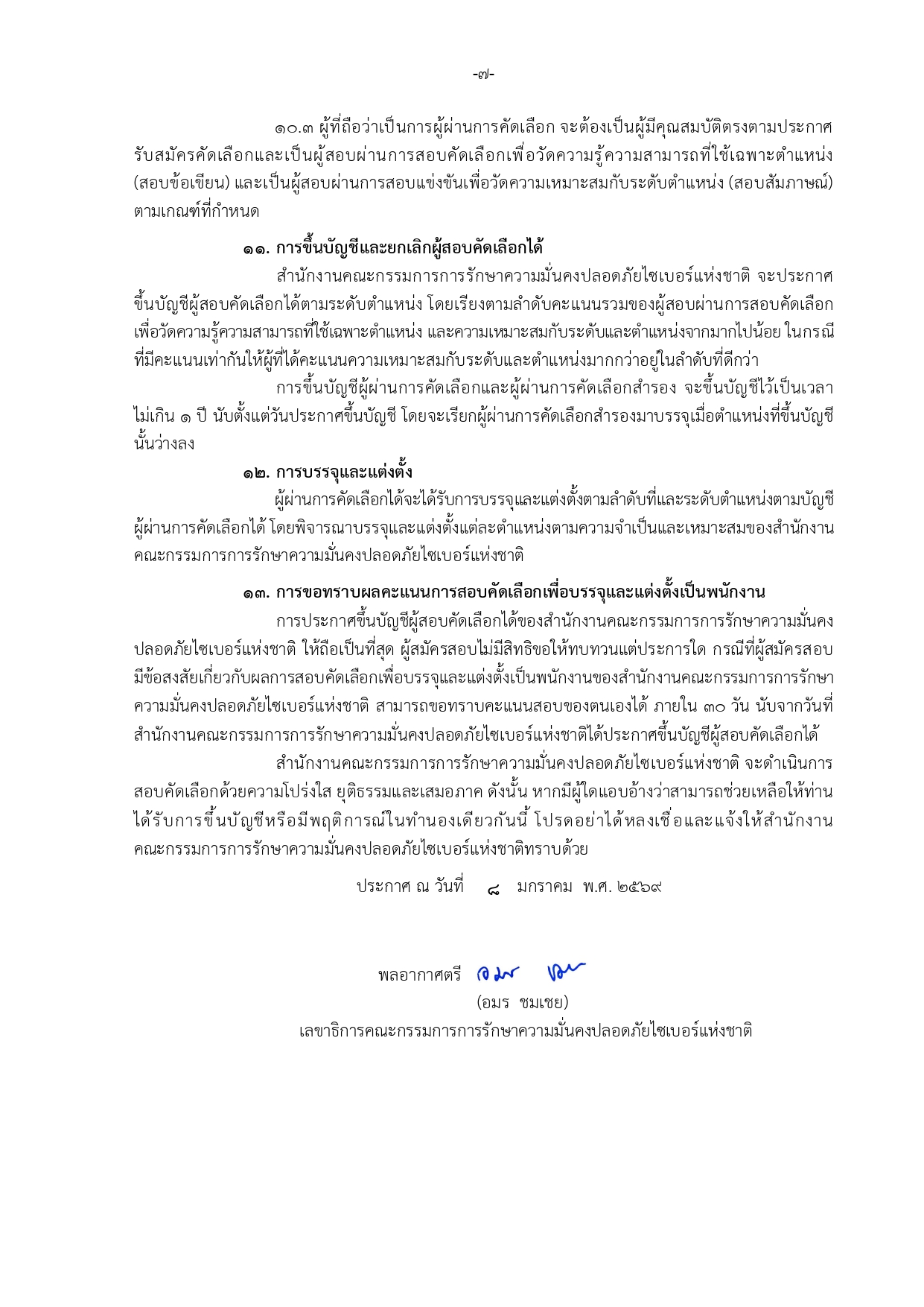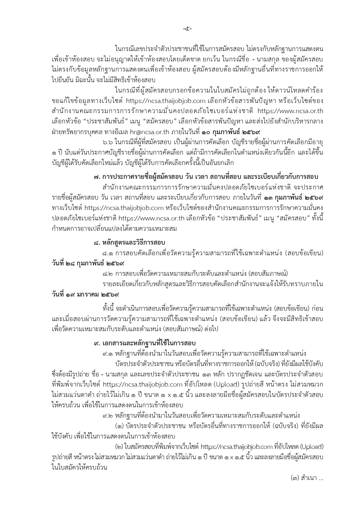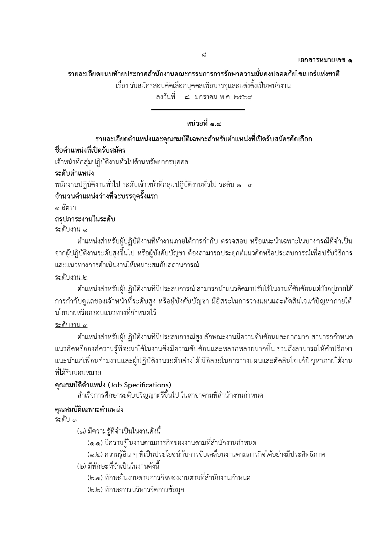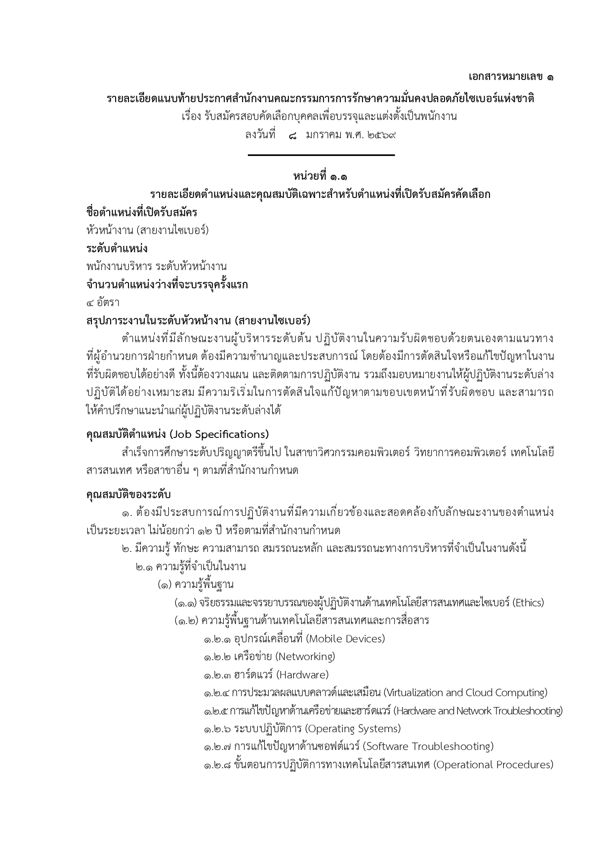 ประกาศสำนักงานคณะกรรมการการรักษาความมั่นคงปลอดภัยไซเบอร์แห่งชาติ เรื่อง แก้ไขเพิ่มเติมรายละเอียดแนบท้ายประกาศสำนักงานคณะกรรมการการรักษาความมั่นคงปลอดภัยไซเบอร์แห่งชาติ เรื่อง รับสมัครสอบคัดเลือกบุคคลเพื่อบรรจุและแต่งตั้งเป็นพนักงาน ลงวันที่ ๘ มกราคม พ.ศ. ๒๕๖๙