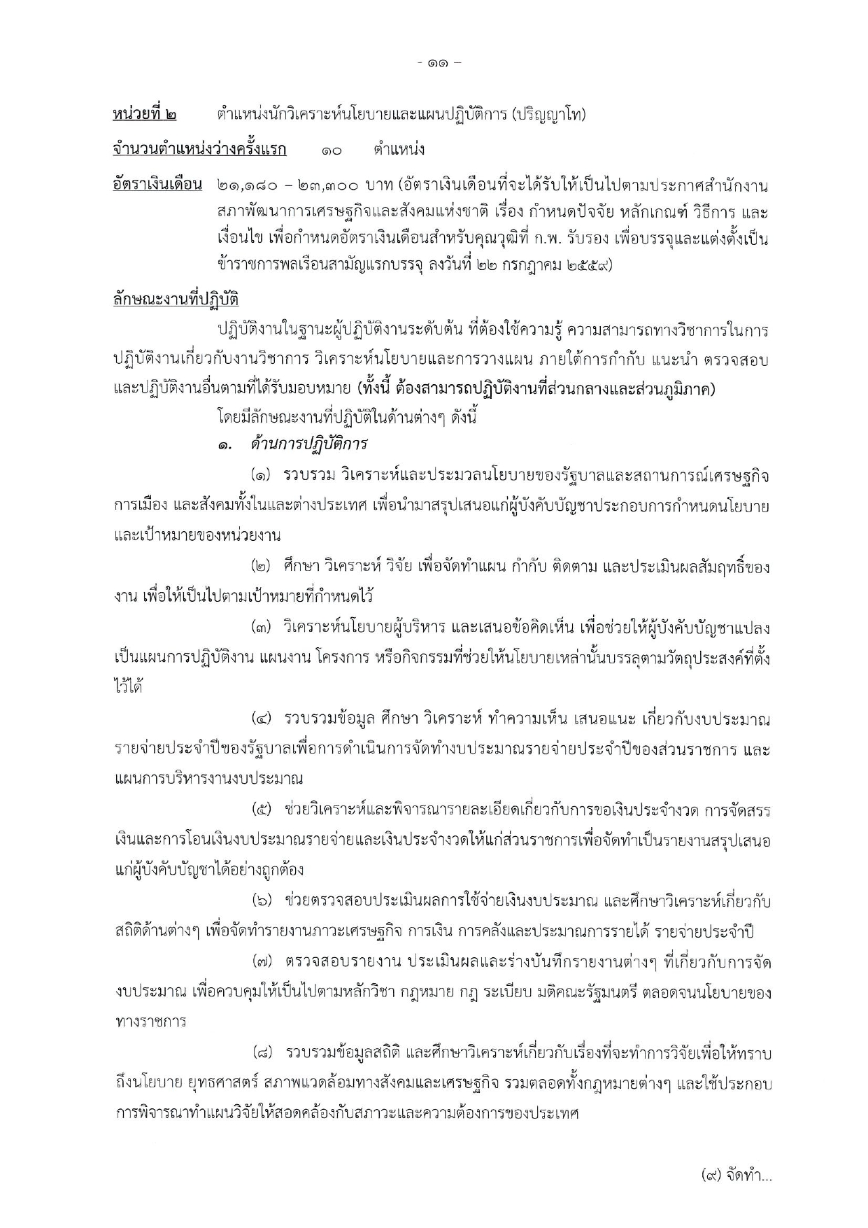 ตำแหน่งนักวิเคราะห์นโยบายและแผนปฏิบัติการ: ปฏิบัติงานด้านวิชาการ วิเคราะห์นโยบายและวางแผน รวบรวมข้อมูล วิเคราะห์สถานการณ์เศรษฐกิจและสังคม เพื่อจัดทำแผนยุทธศาสตร์ ติดตามและประเมินผลโครงการ รวมถึงการวิเคราะห์งบประมาณและงานวิจัยต่างๆ