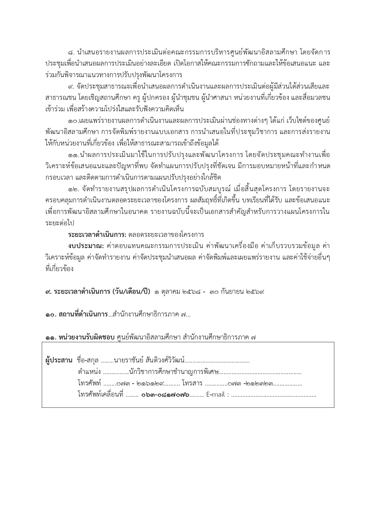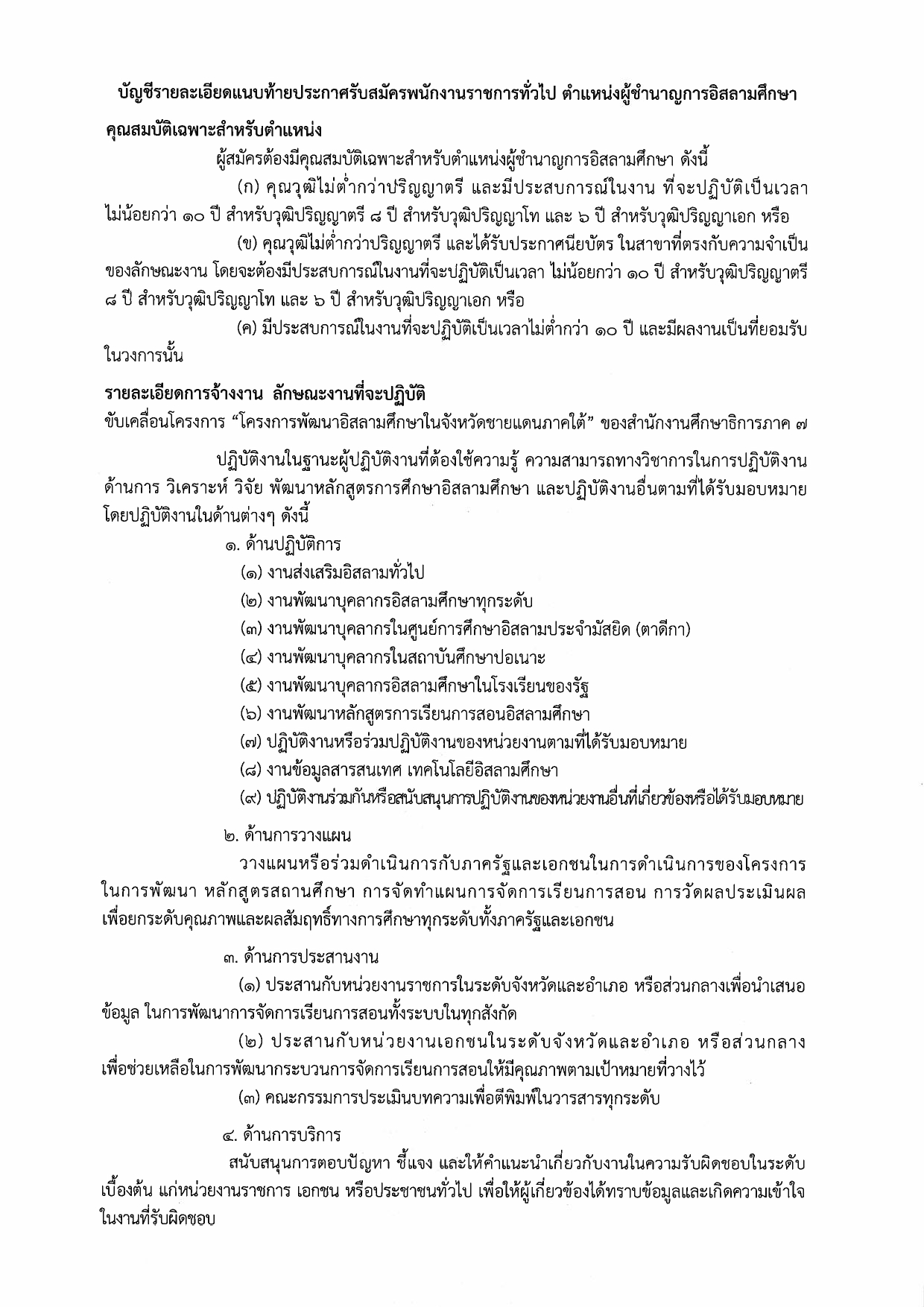 ตำแหน่งนี้มีหน้าที่หลักในการ ขับเคลื่อนโครงการ “โครงการพัฒนาอิสลามศึกษาในจังหวัดชายแดนภาคใต้” ของสำนักงานศึกษาธิการภาค 7 โดยปฏิบัติงานในฐานะผู้เชี่ยวชาญด้านการวิเคราะห์ วิจัย และพัฒนาหลักสูตรการศึกษาอิสลามศึกษา ครอบคลุมงาน 4 ด้านหลัก ดังนี้: