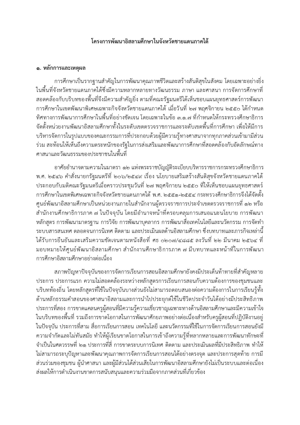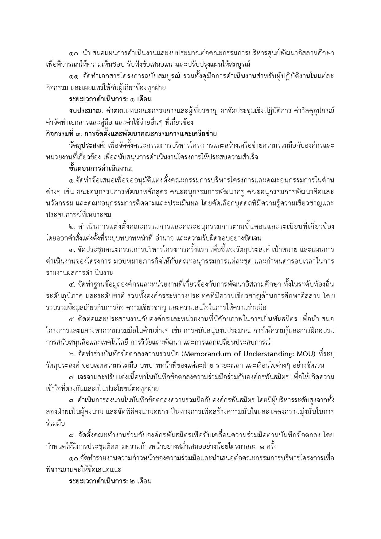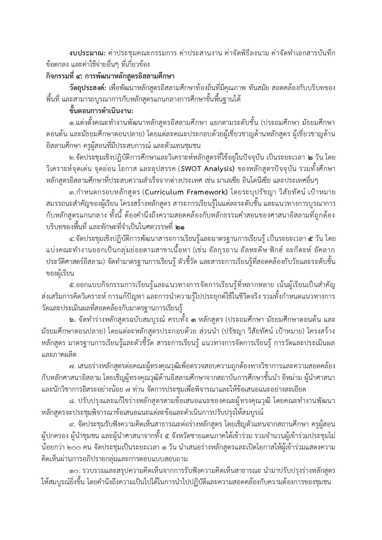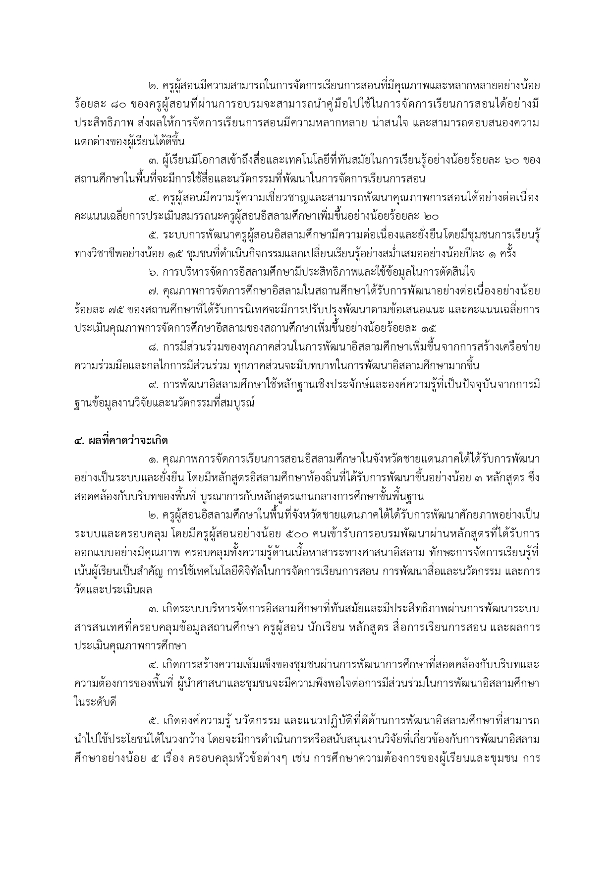 1. ด้านปฏิบัติการ: เน้นการส่งเสริมอิสลามทั่วไป การพัฒนาบุคลากรอิสลามศึกษาทุกระดับ (ตาดีกา, ปอเนาะ, โรงเรียนของรัฐ) การพัฒนาหลักสูตรการเรียนการสอน และงานข้อมูลสารสนเทศ เทคโนโลยีอิสลามศึกษา