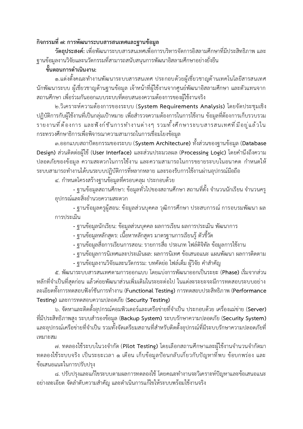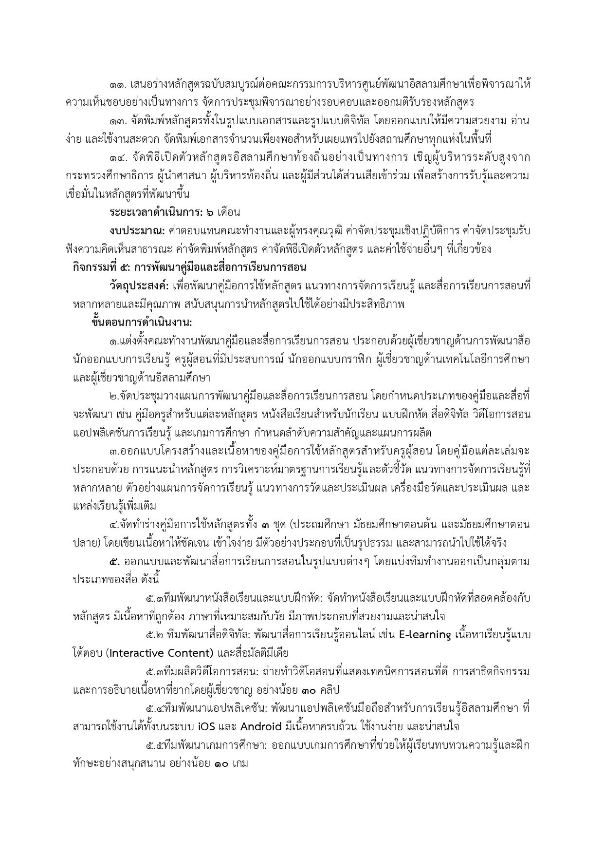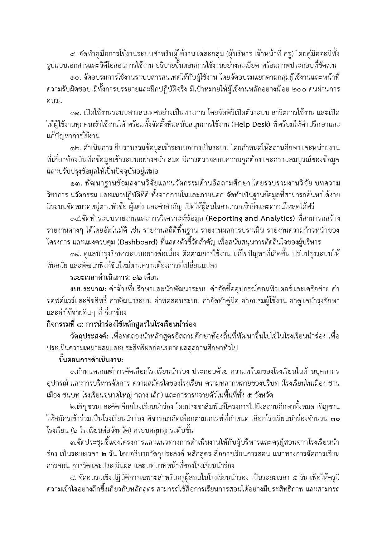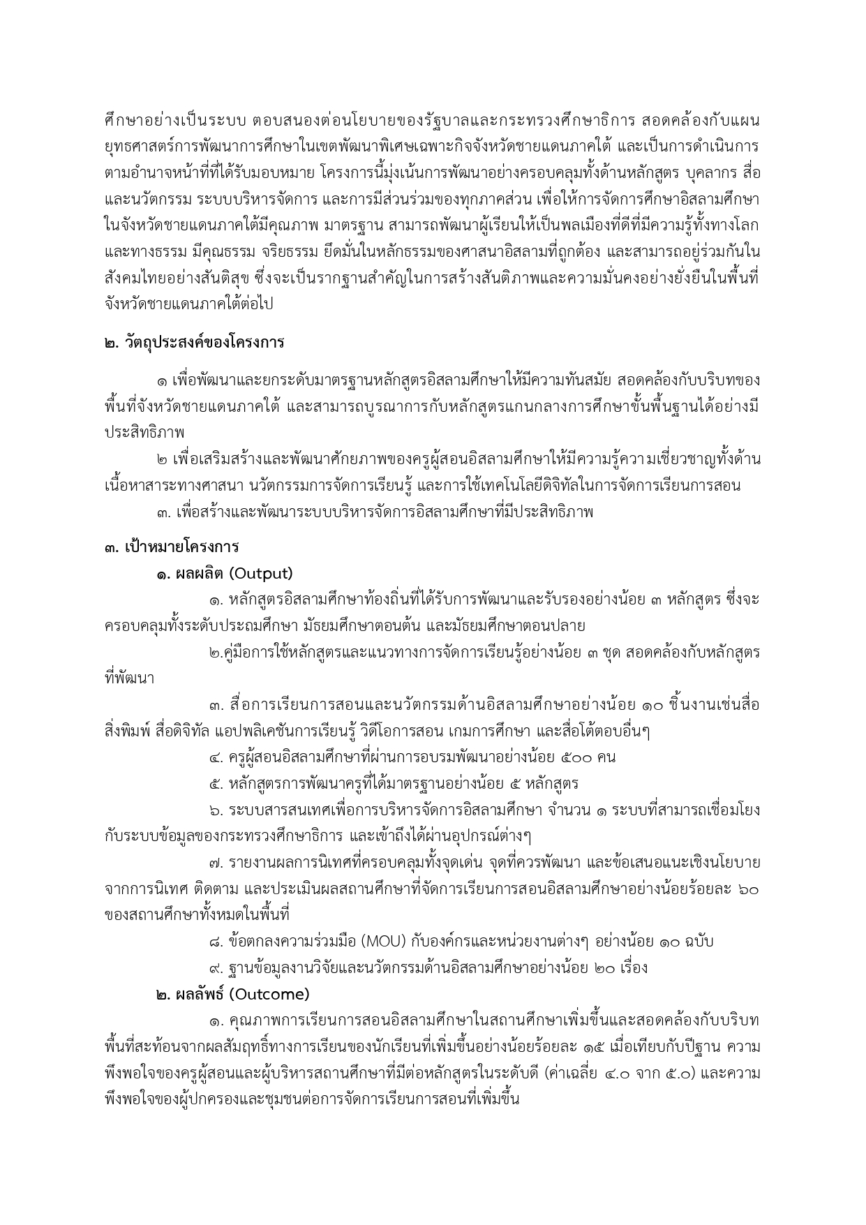1. ด้านปฏิบัติการ: เน้นการส่งเสริมอิสลามทั่วไป การพัฒนาบุคลากรอิสลามศึกษาทุกระดับ (ตาดีกา, ปอเนาะ, โรงเรียนของรัฐ) การพัฒนาหลักสูตรการเรียนการสอน และงานข้อมูลสารสนเทศ เทคโนโลยีอิสลามศึกษา
