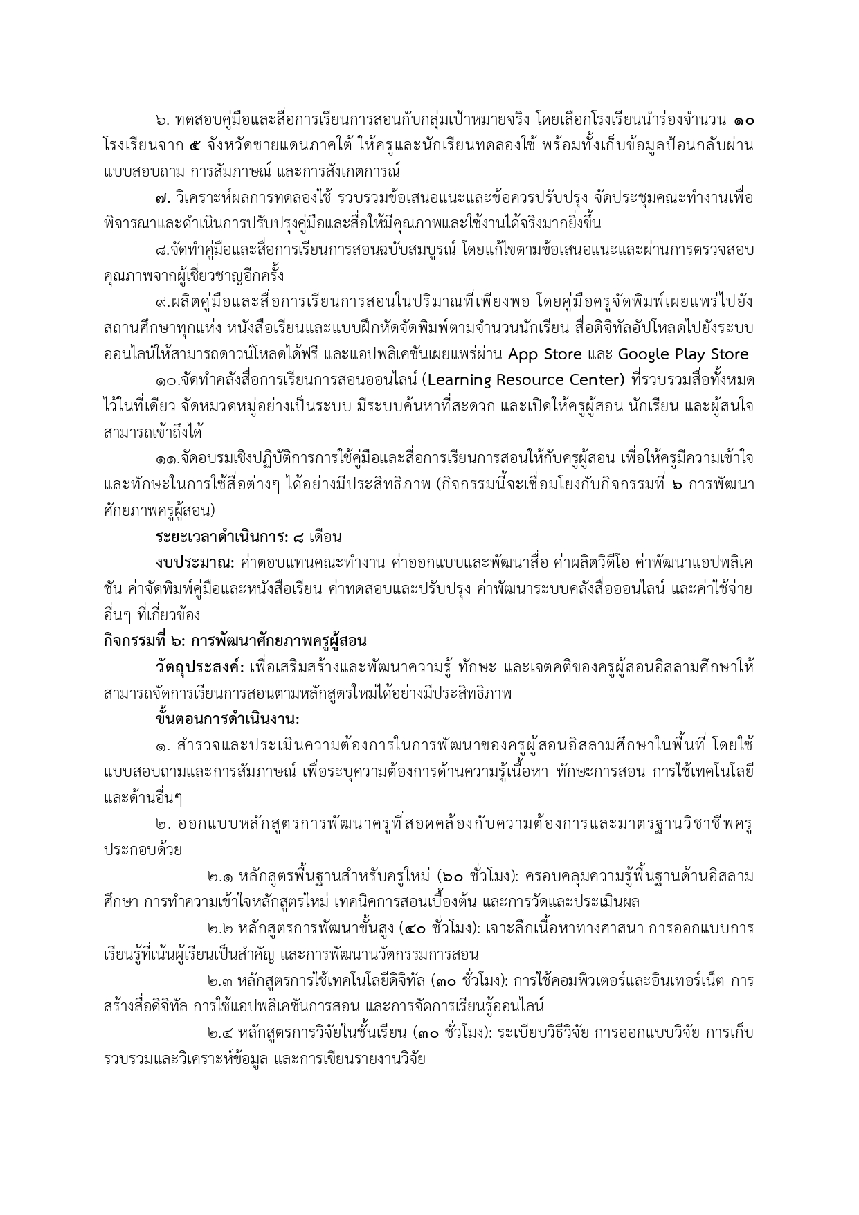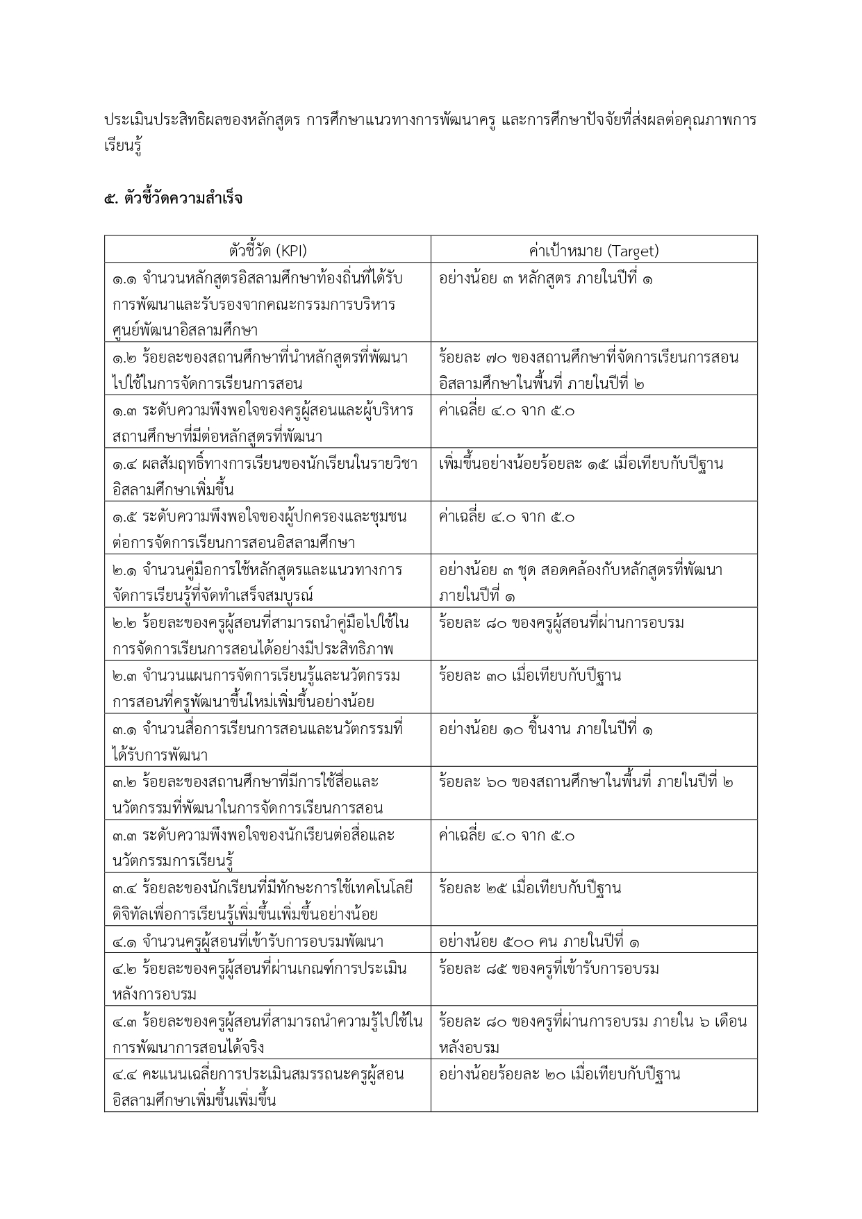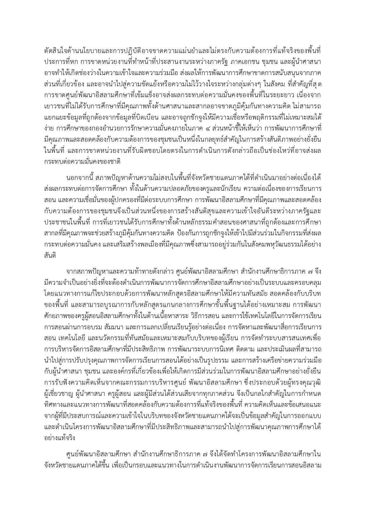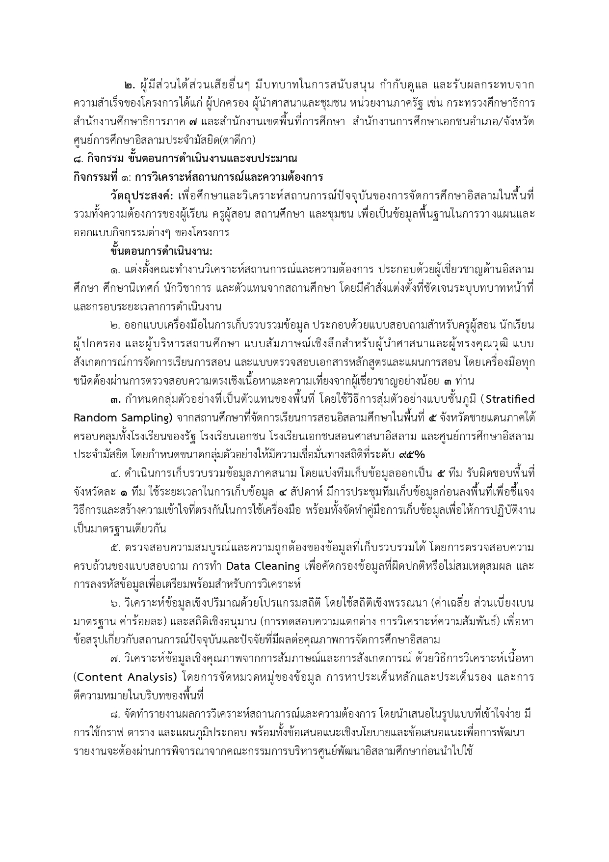 1. ด้านปฏิบัติการ: เน้นการส่งเสริมอิสลามทั่วไป การพัฒนาบุคลากรอิสลามศึกษาทุกระดับ (ตาดีกา, ปอเนาะ, โรงเรียนของรัฐ) การพัฒนาหลักสูตรการเรียนการสอน และงานข้อมูลสารสนเทศ เทคโนโลยีอิสลามศึกษา